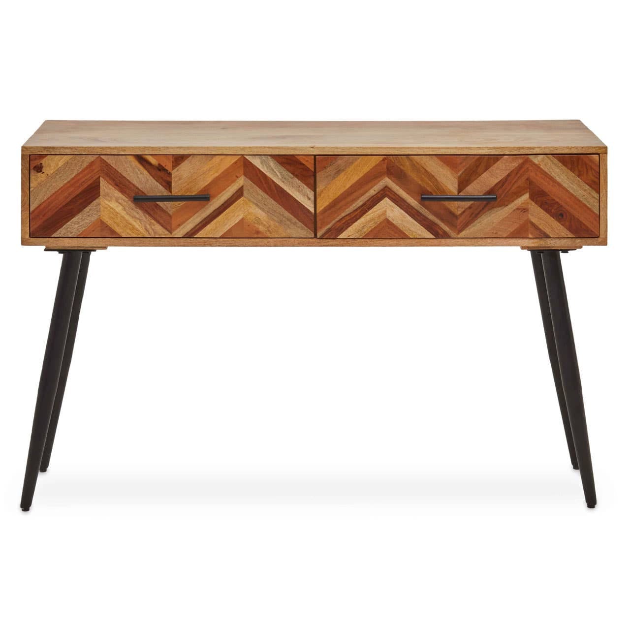 The Boho two-door console table uses varying shades of mango wood to create a dynamic, multi-tonal texture, blending Mid-century Modern style with artisan craftsmanship. A handcrafted chevron pattern covers the entire front surface and is contrasted with slim black metal bar handles and tapered legs.