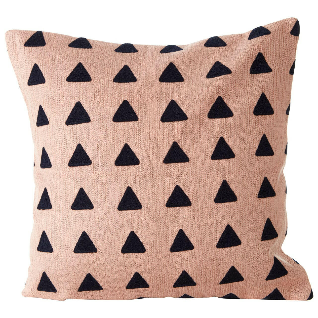 The removable rectangular cushion cover is woven from a textured cotton and acrylic mix. The pink background colour and contrasting blue triangle pattern ensure that it will stand out wherever it is displayed.