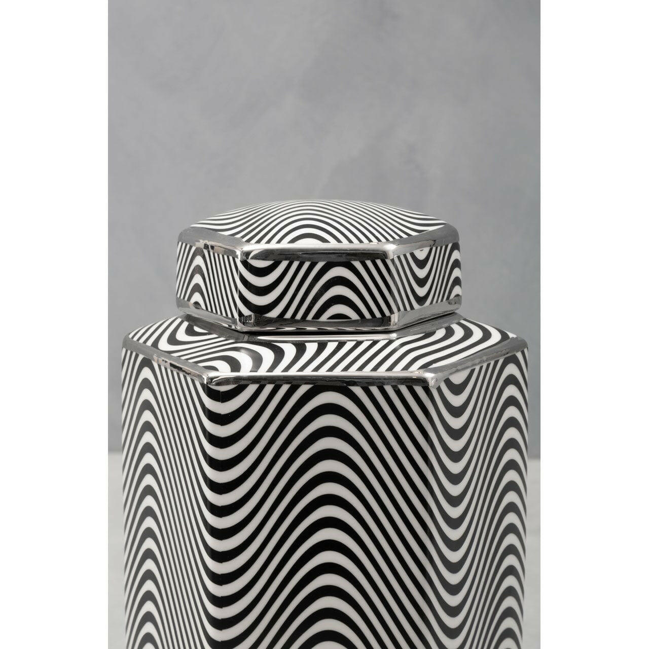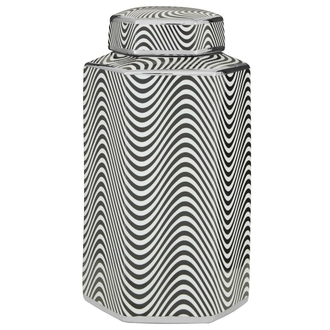 Featuring silver detail on top and bottom rims, this elegant jar is crafted from robust porcelain in hexagonal silhouette. The stylish wavy pattern on outer enhances its eye-catching visual aesthetic.