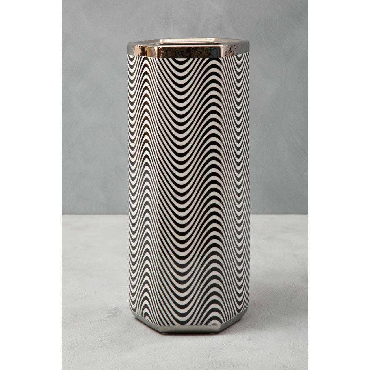 Celeste Umbrella Stand is the perfect addition to any home. Made from robust porcelain, this freestanding umbrella holder features a stylish wavy pattern and a reflective silver hexagonal rim for added finesse. The black and white tones on the outer surface add a touch of elegance to any space.