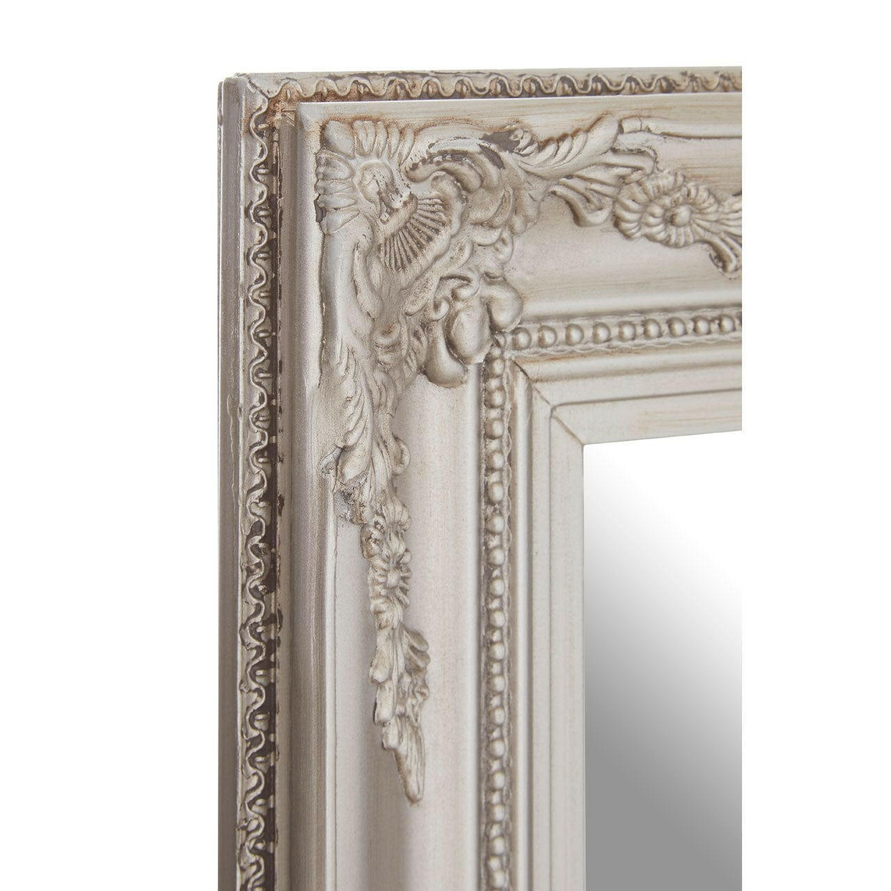 This mirror's exquisite decorative detail is informed by classical Regency design. Each corner displays floral reliefs, while intricate beading around the outer frame and mirrored surface enhances the overall aesthetic. Its silver finish is slightly weathered, contributing to its antique look. Coordinate it with opulent boutique hotel home furnishings.