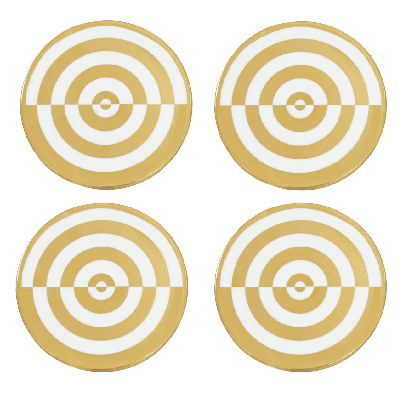 This stylish set of four ceramic coasters boasts a luxurious white and gold colour scheme. Each round coaster is adorned with a distinctive concentric circle pattern in gold against a crisp white background, with the design neatly split horizontally across its diameter. These pieces offer a glamorous and protective accent for any table.