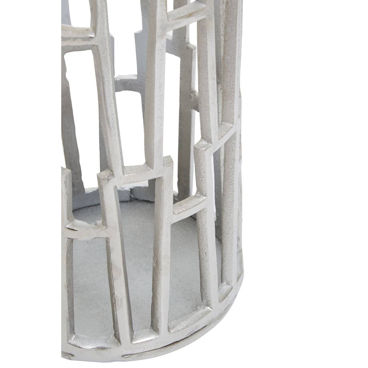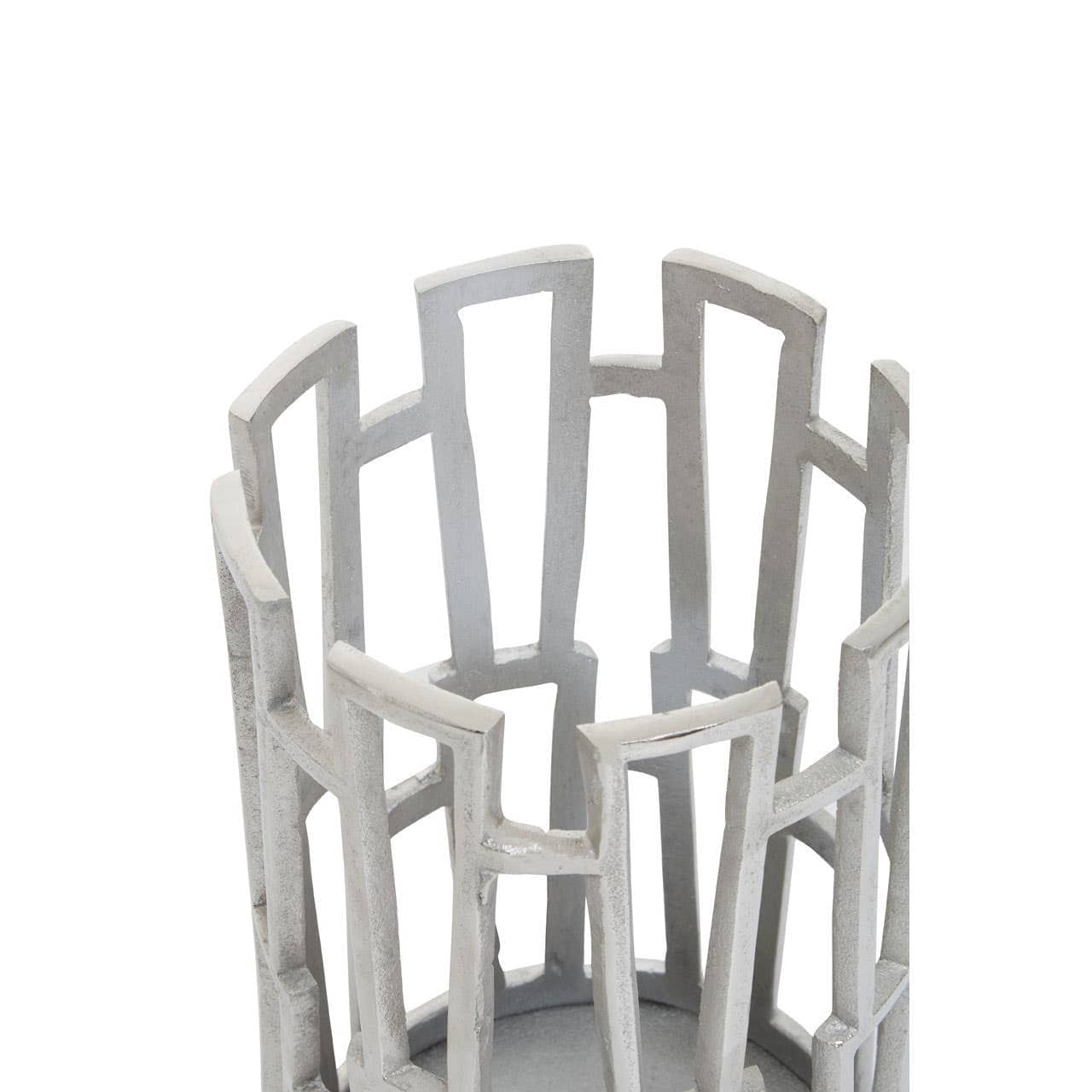 The distinctive design of this candle holder goes well with a contemporary home. This holder is intricately handcrafted from robust aluminium and given a silver finish that exudes radiance, and the cut-out detail creates an art deco allure.