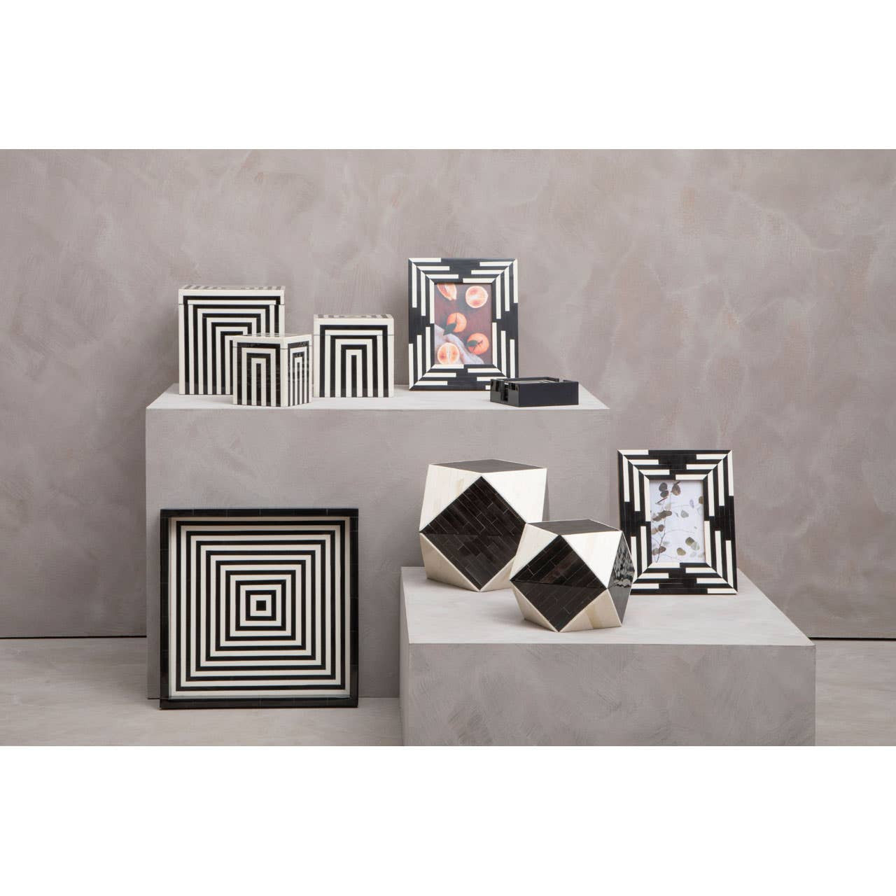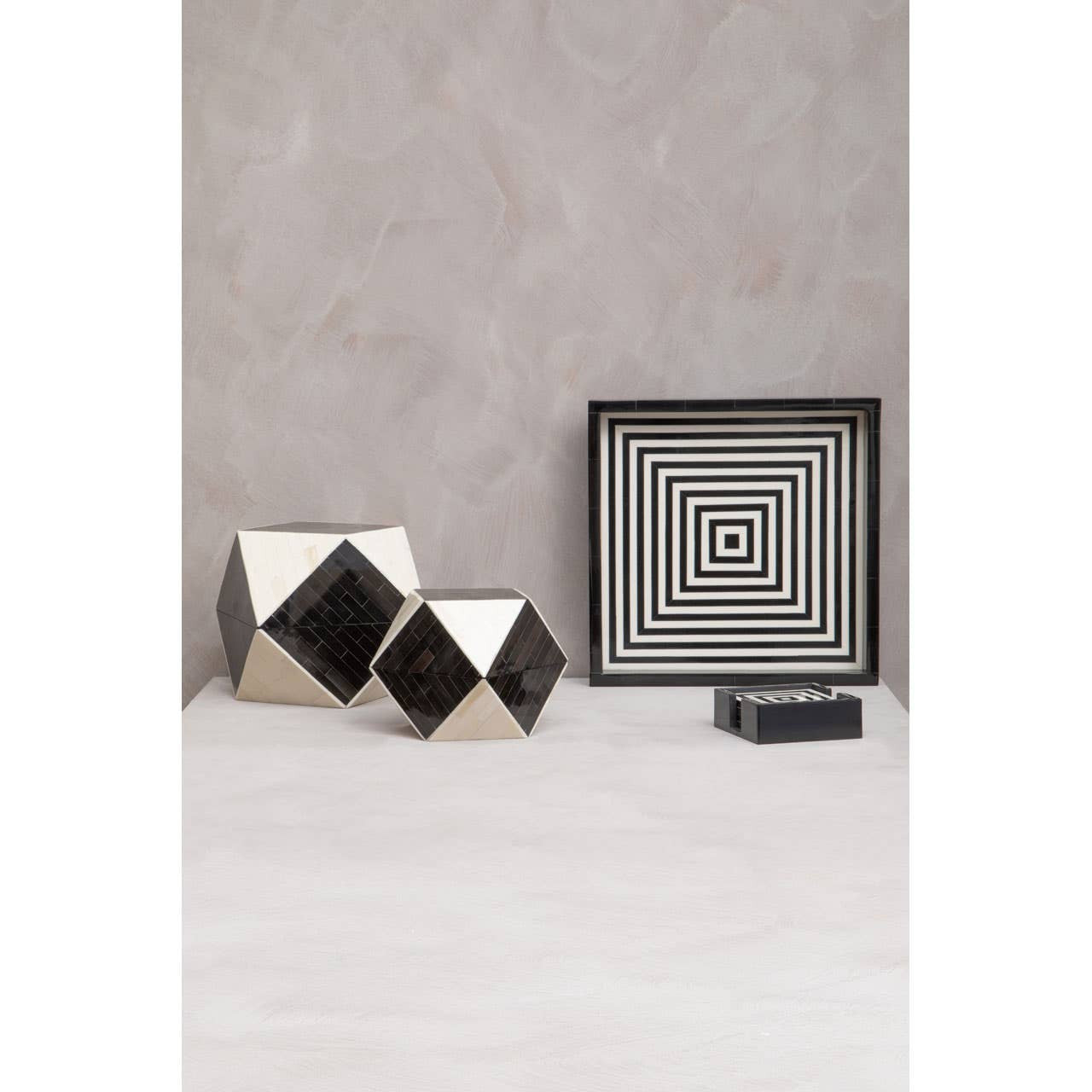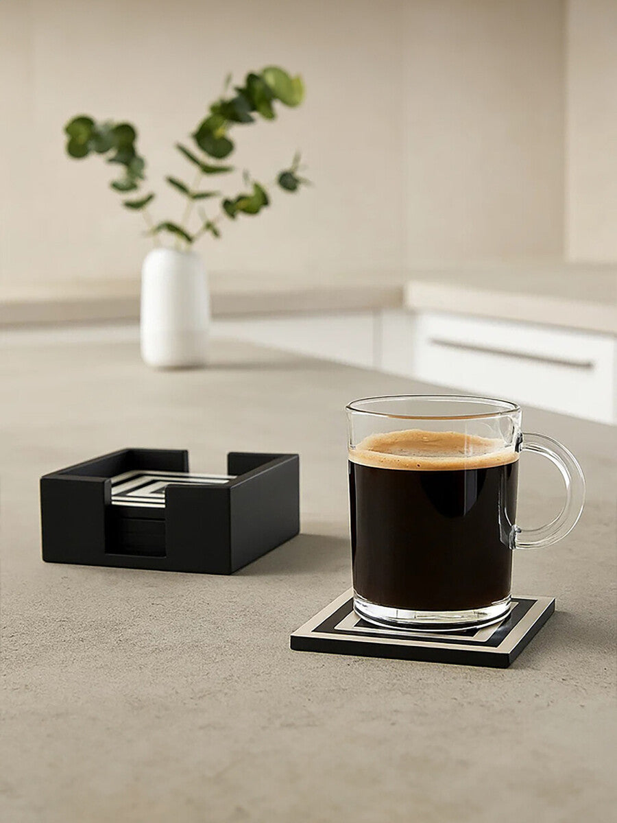 Enhance any dining or coffee table with these coasters, featuring a bold black and white striped design. These coasters protect surfaces while adding a modern touch. The matching holder keeps them neatly stored, making them a chic and practical addition to any space.