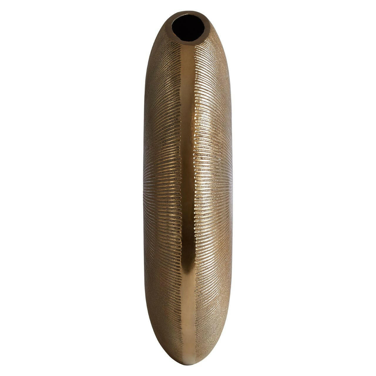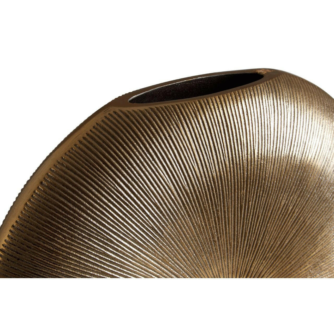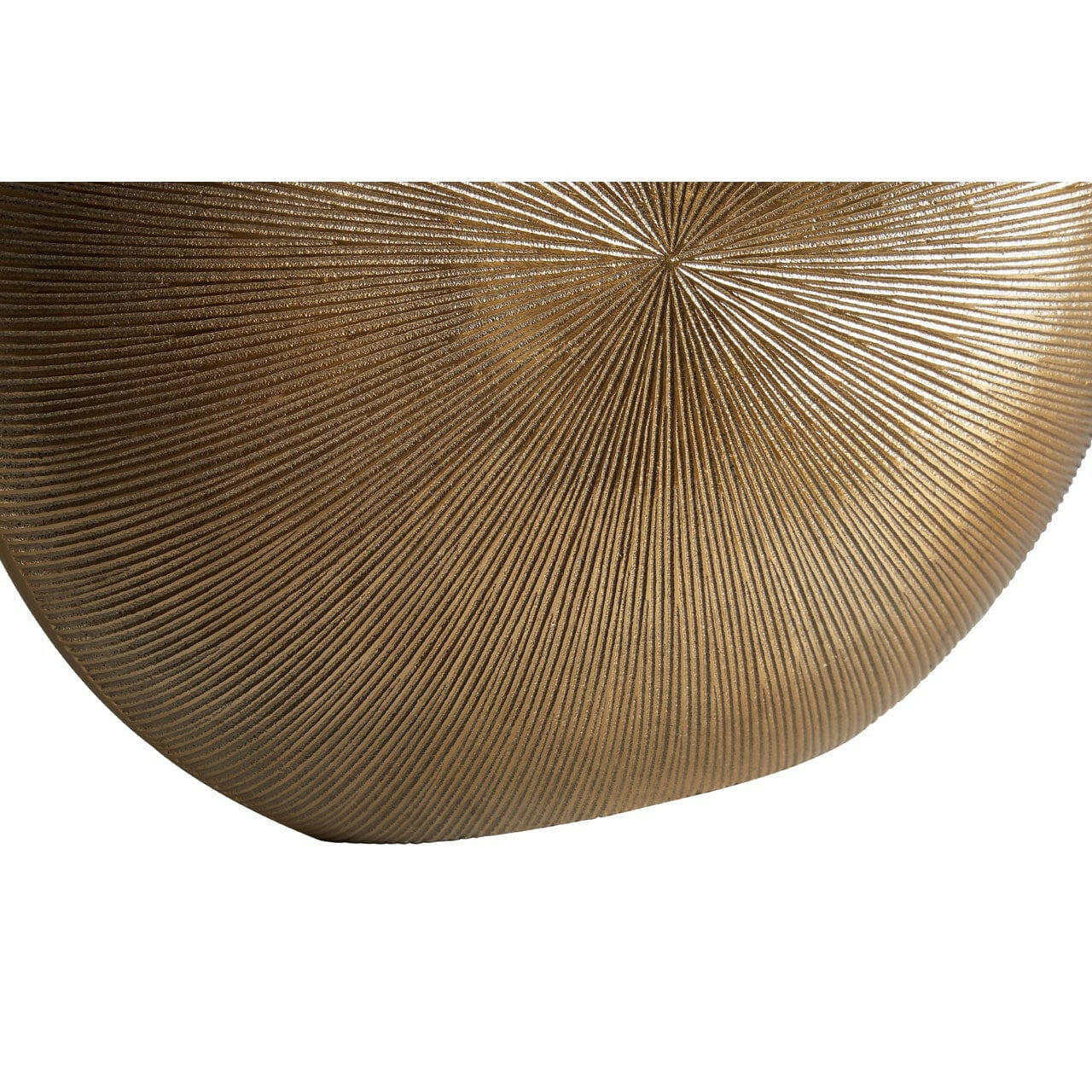 The small Estrella vase is round in shape, its slender design inspired by forms found in nature. A small oval opening in the top of the vase allows for it to be filled with flowers. The vase's façade features a fluted design, with thin grooves extending outward from the centre. Created from metal, the stylish vase boasts a gold finish.