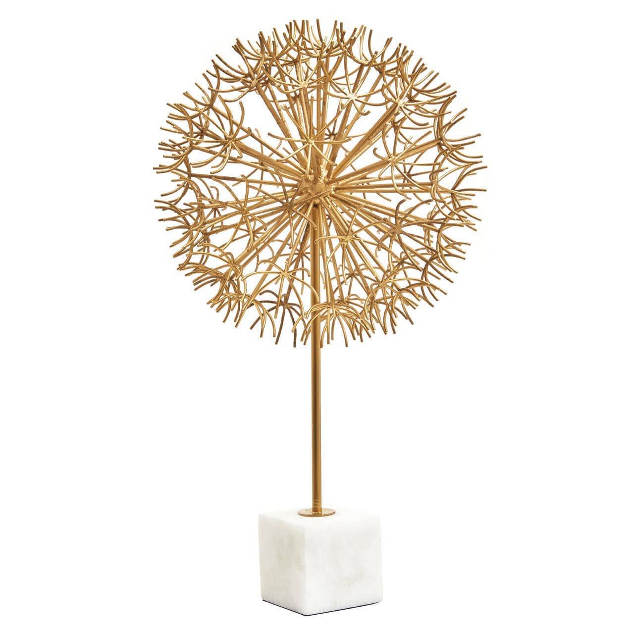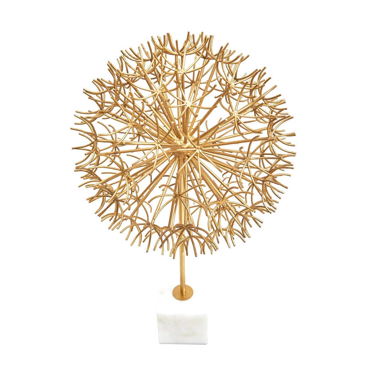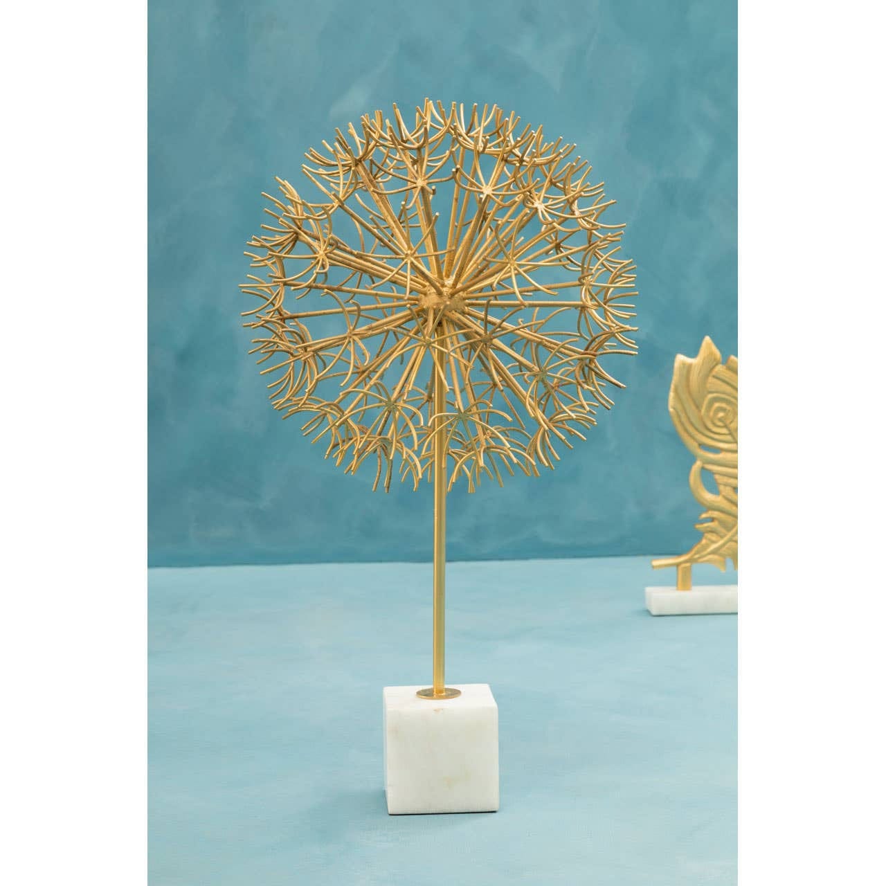This captivating sculpture features a beautifully intricate gold dandelion seed head rising from a sleek white marble base. The spherical dandelion form is crafted from numerous slender, radiating gold-finished metallic elements, creating a delicate yet striking silhouette. Mounted on a solid, square white marble cube base, this piece offers a decorative accent for any contemporary or luxurious interior.