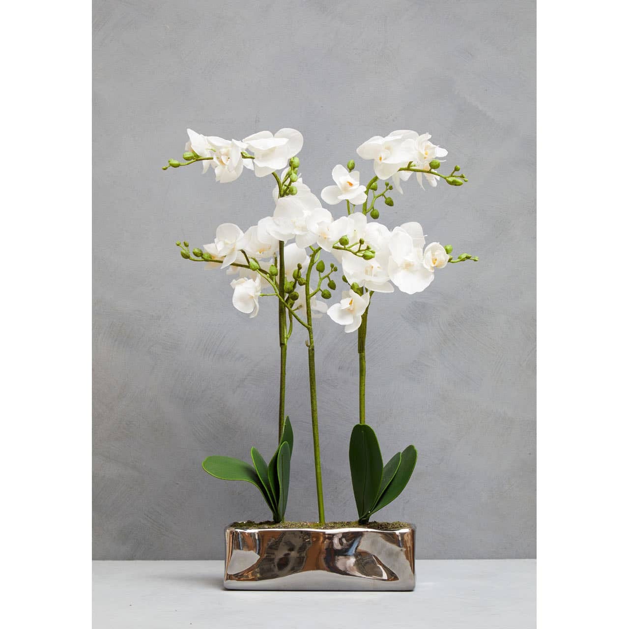 This plant has an arrangement of faux white phalaenopsis blooms with verdant succulents, nestled into a rectangular ceramic pot. The faux orchids will add a real touch to a floral setting with a silver finish container that elevates the luxe aesthetic.