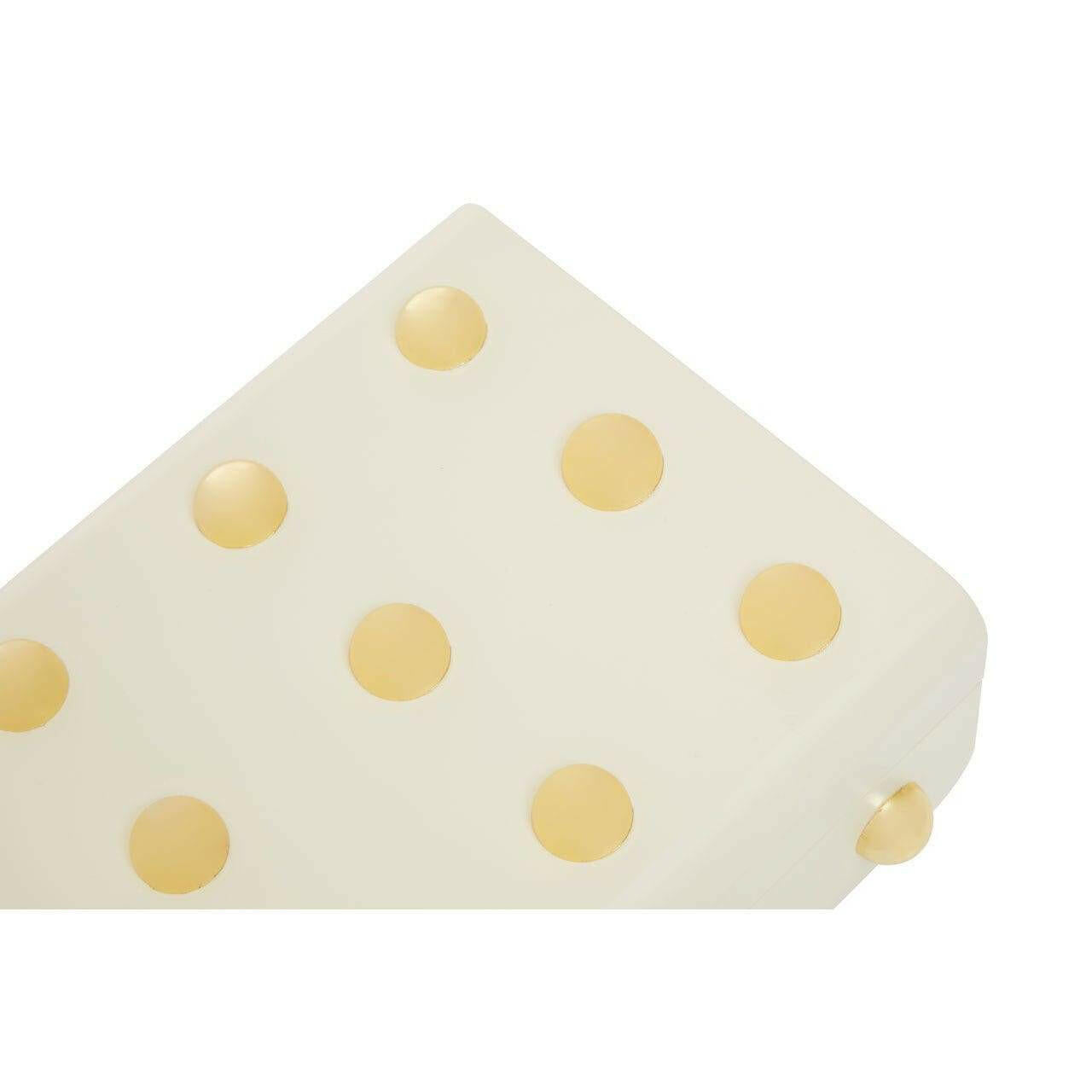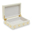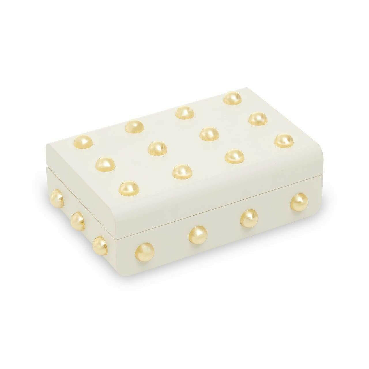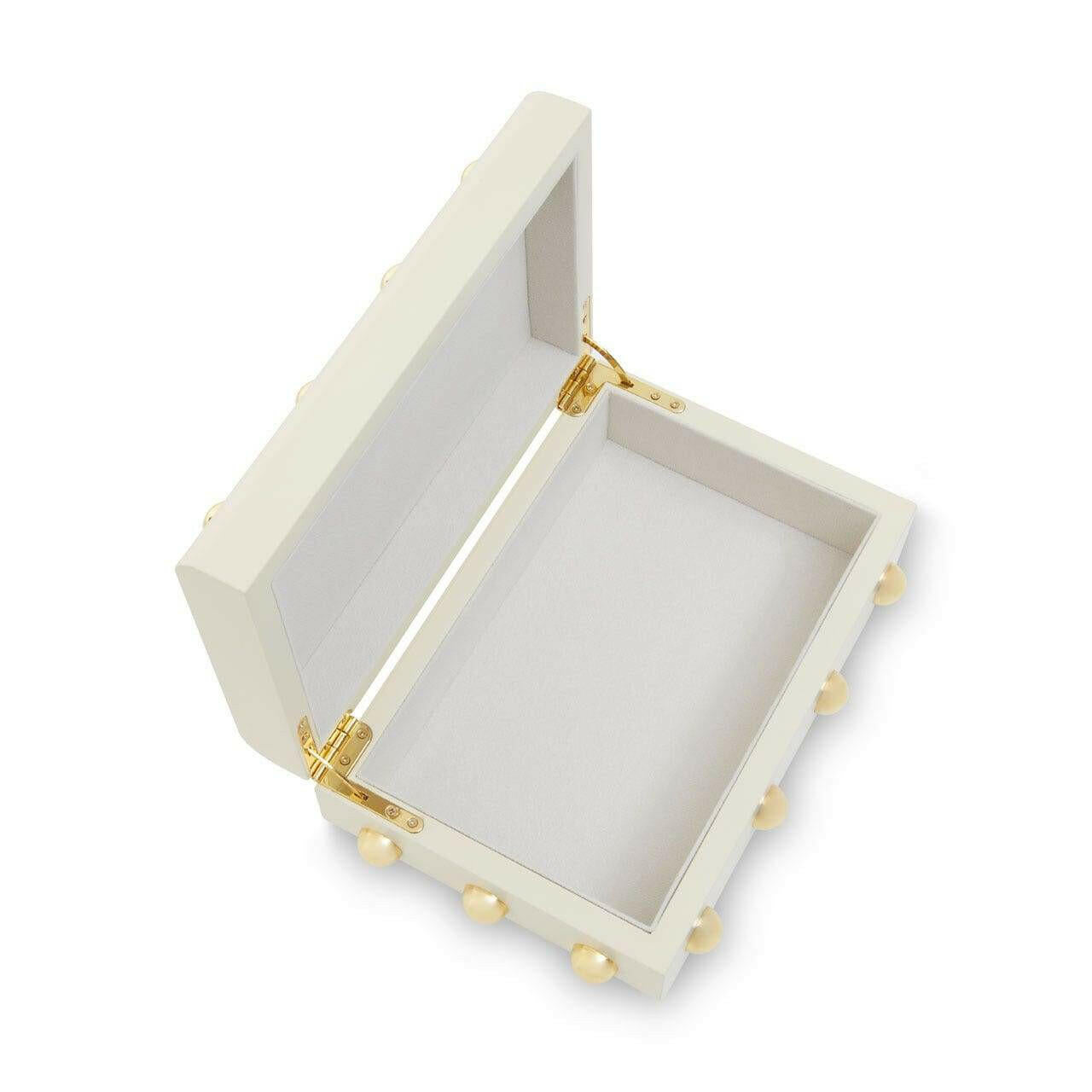 This small trinket box in the cream finish is a classic combination of organic and modern style. Skilfully made from MDF and accentuated with stud detail in the warm metallic finish, this trinket box brings a luxurious touch to side tables and vanities.
