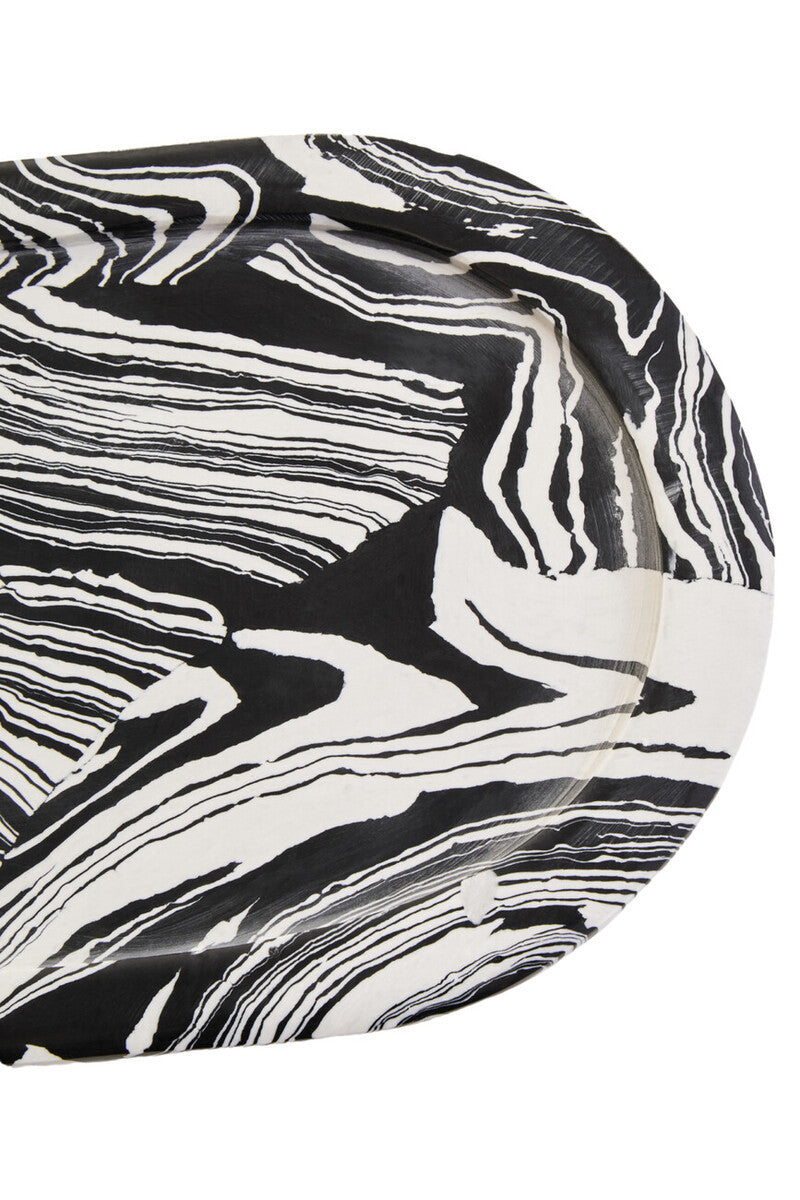 Handcrafted from two tonal marble, this decorative tray boasts an oval shape with raised edges, accentuating its modern aesthetics. Ideal for keeping essentials close at hand, this tray can be displayed as a standalone decorative piece in modern decor settings.