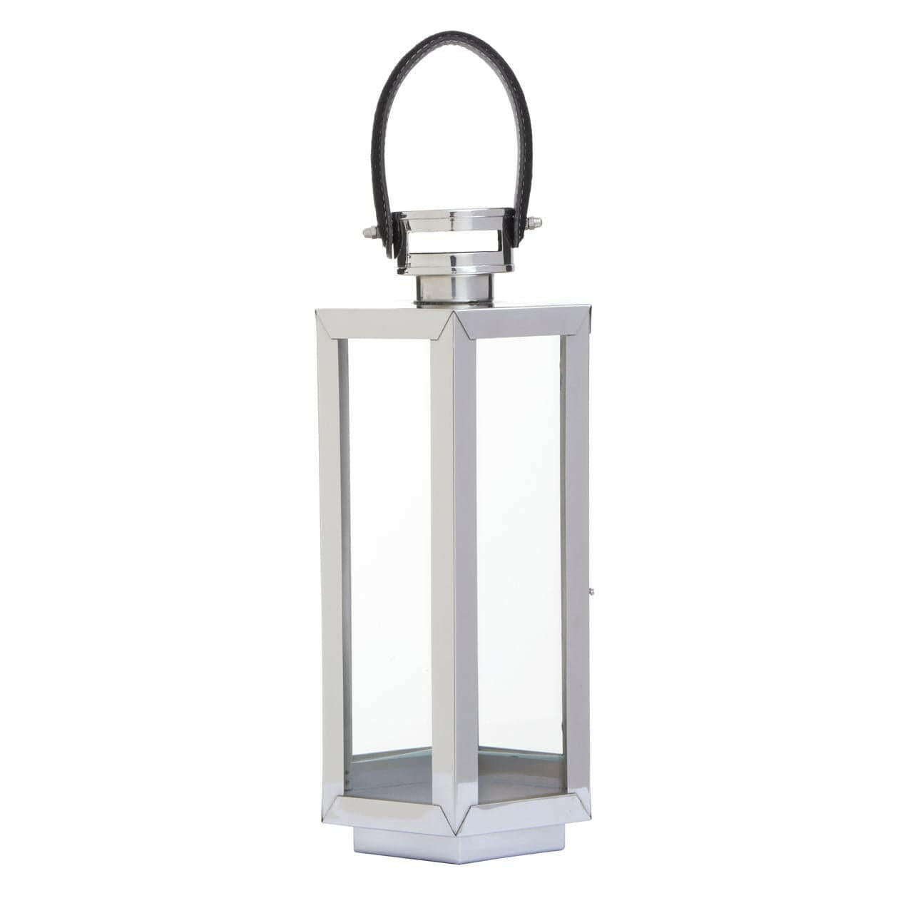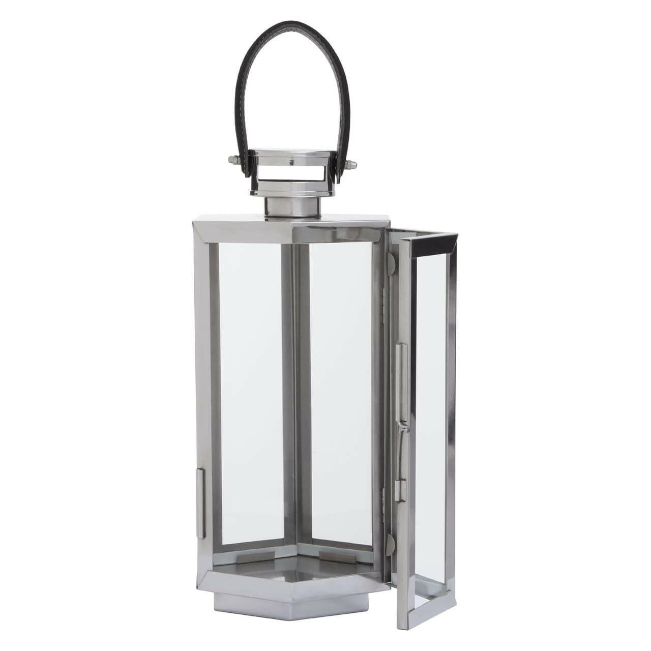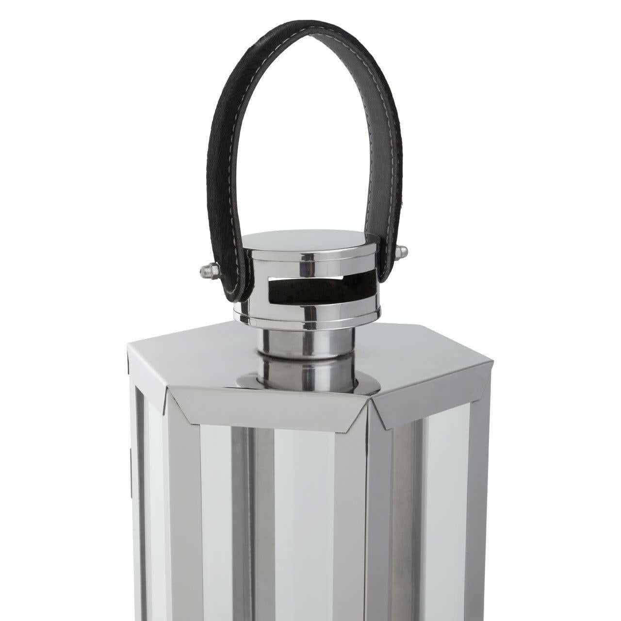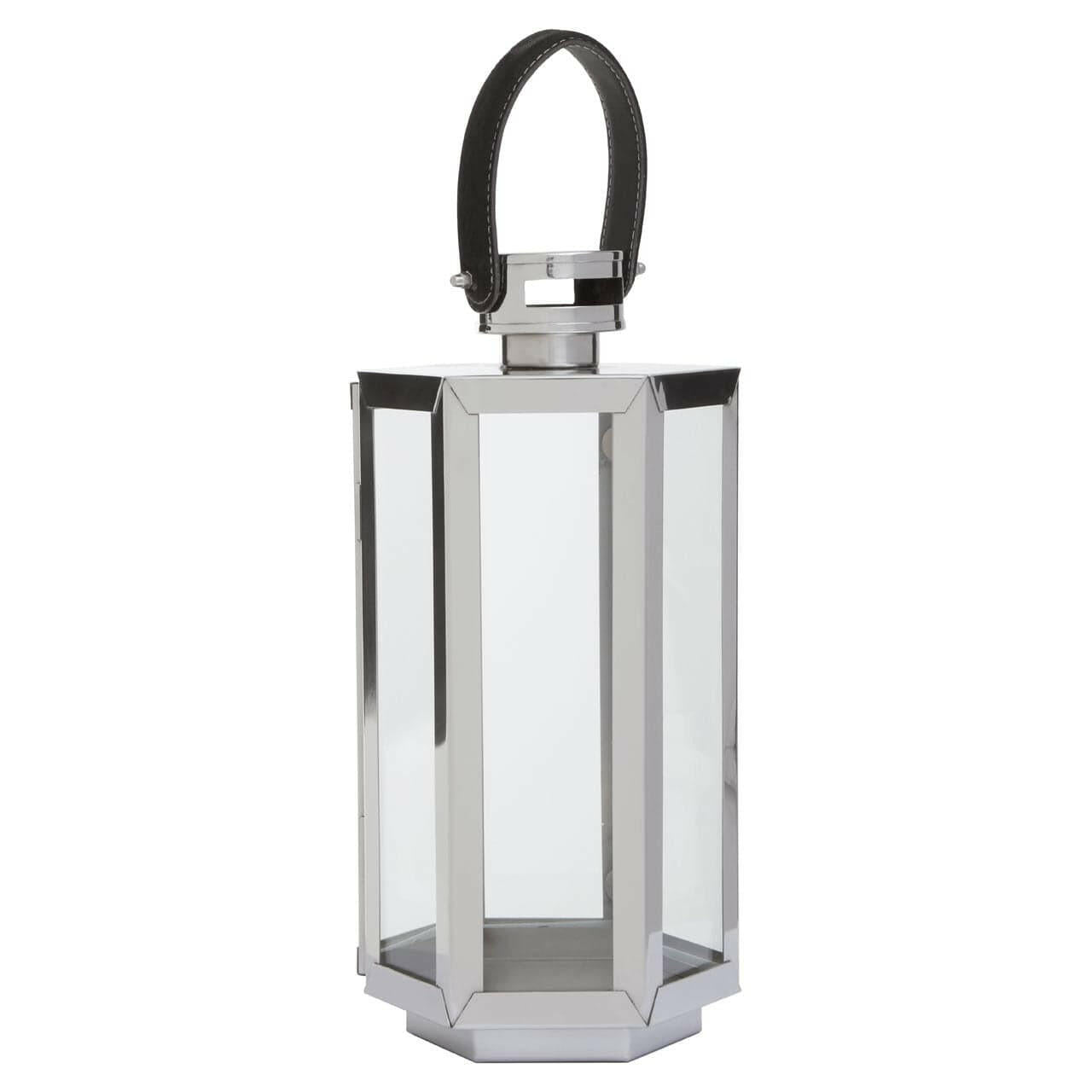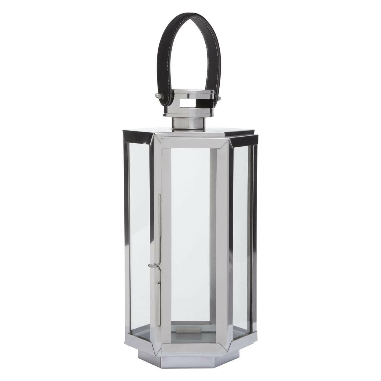 Create an inviting ambience in the home with this hexagonal contemporary lantern. The silver finish stainless steel blends with the clear glass panels, and the leather handle offers an organic contrast.