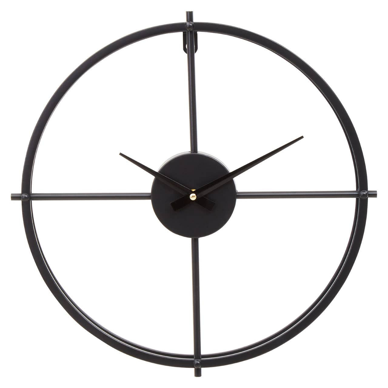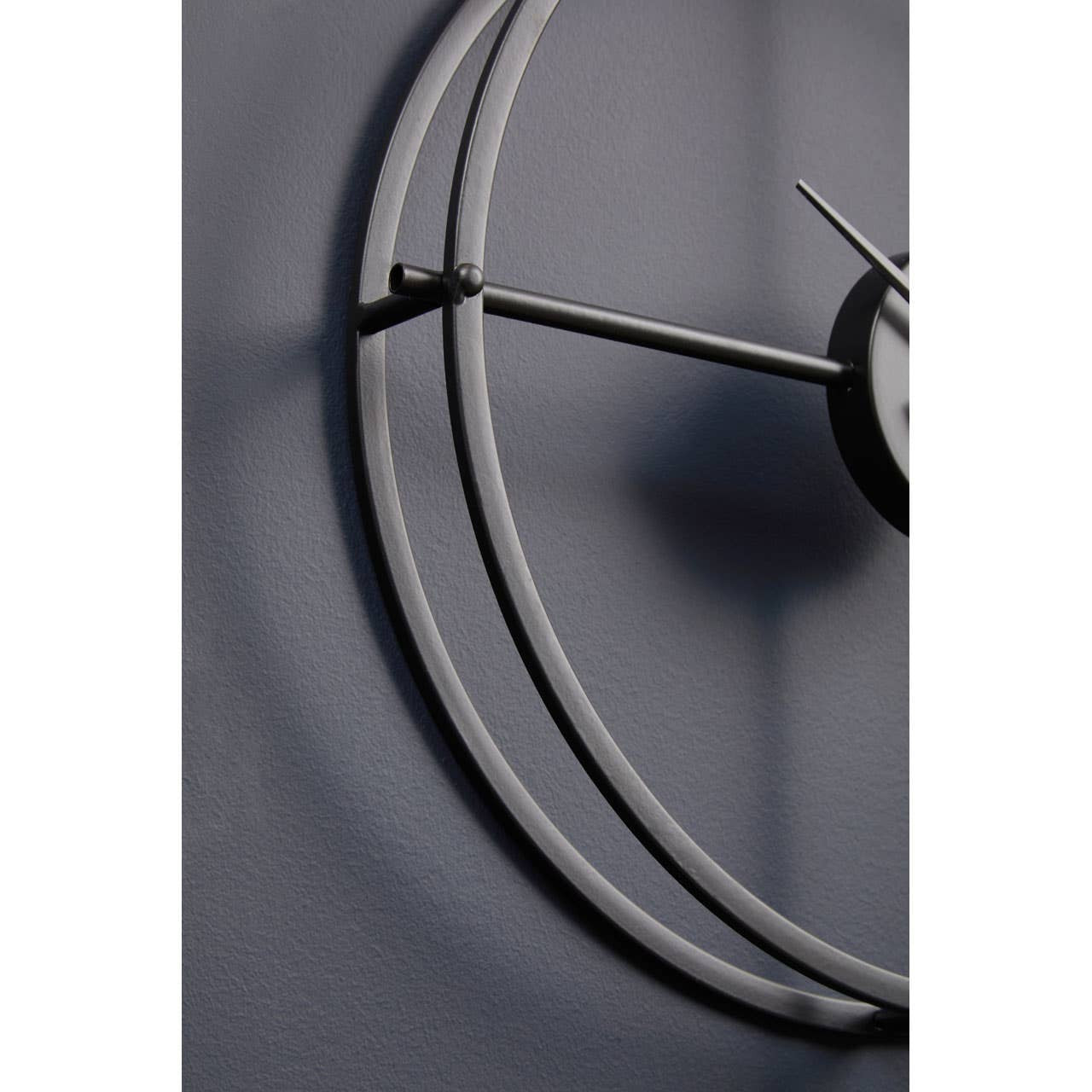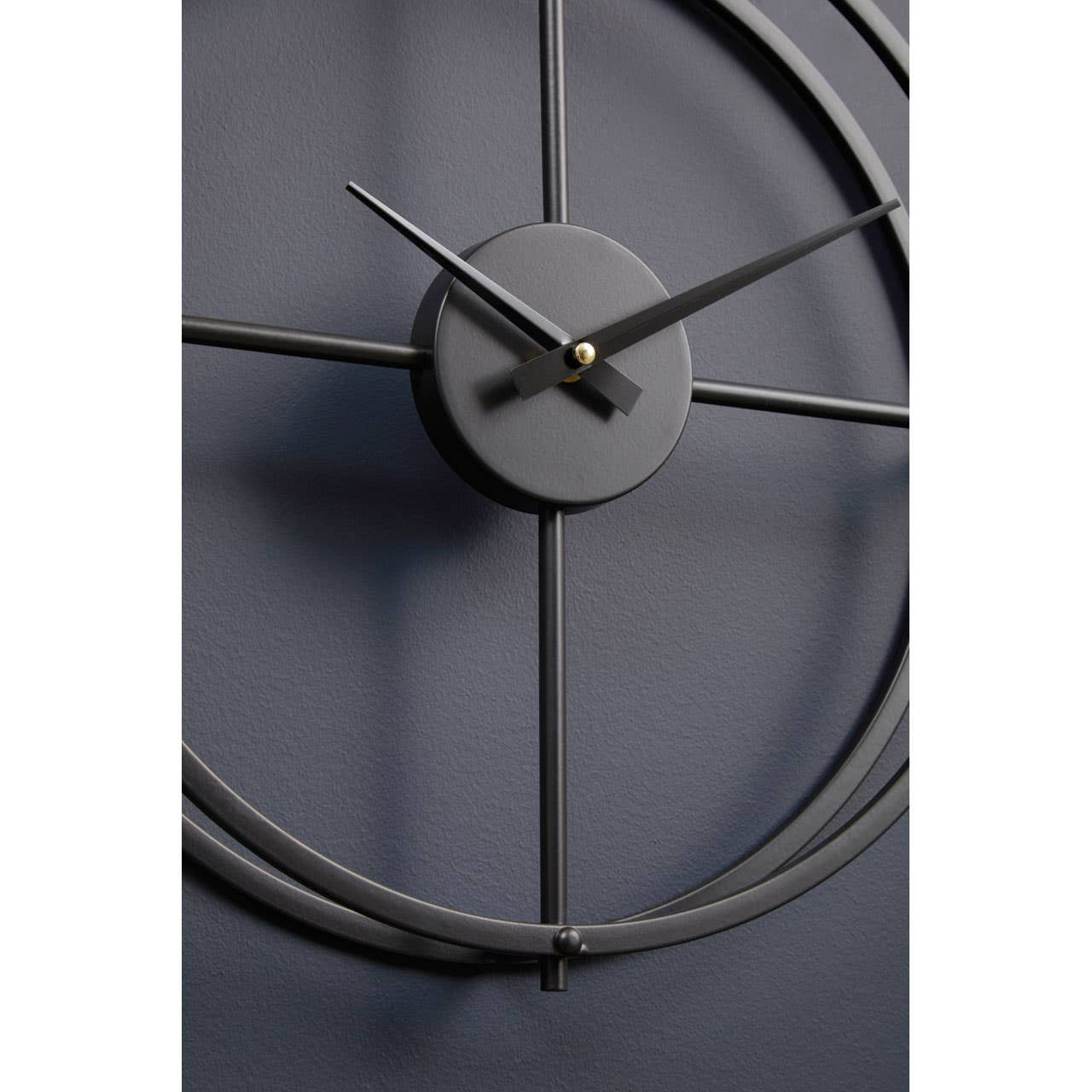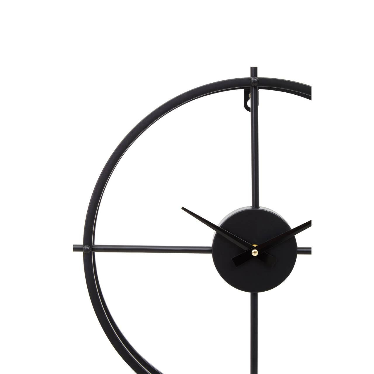 Crafted from metal in a black finish, this small wall clock has a modern and minimalist design with two smooth rings forming its frame. Clean intersecting lines join in the middle to support the dial and slender hands.