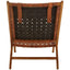 Its frame is made from sustainable teak wood and has very gently arcing design lines. Its natural colour means that the wood's natural grain can be enjoyed. Brown straps made from tactile leather form a lattice pattern across the seat and backrest. Comfort is optimised by the head cushion that drapes across the top of the backrest.