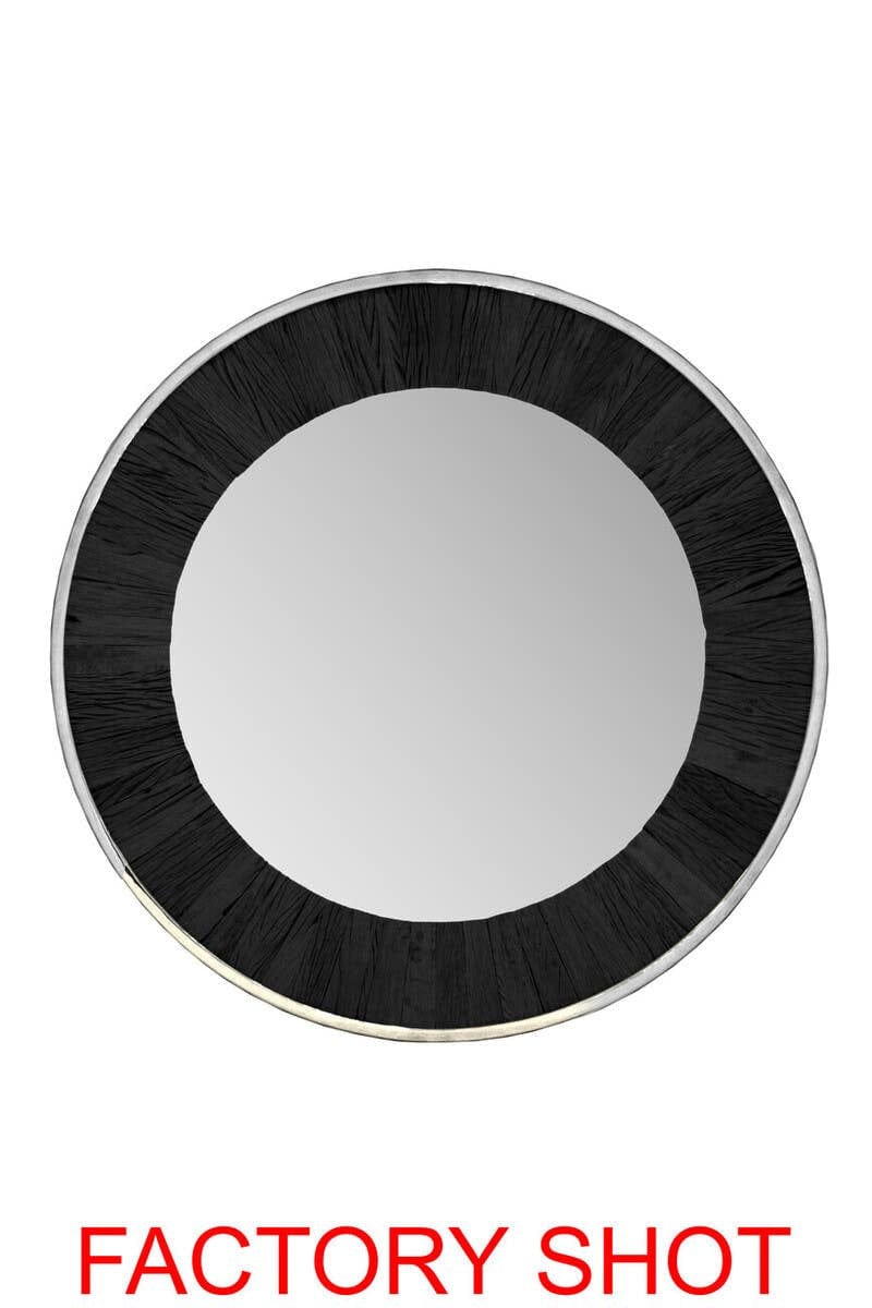 This round wall mirror features silver lined edges that provide a sleek contrast to the warmth of its black finish wood. The natural wood frame has a textured surface, making it a stylish addition to modern interiors.