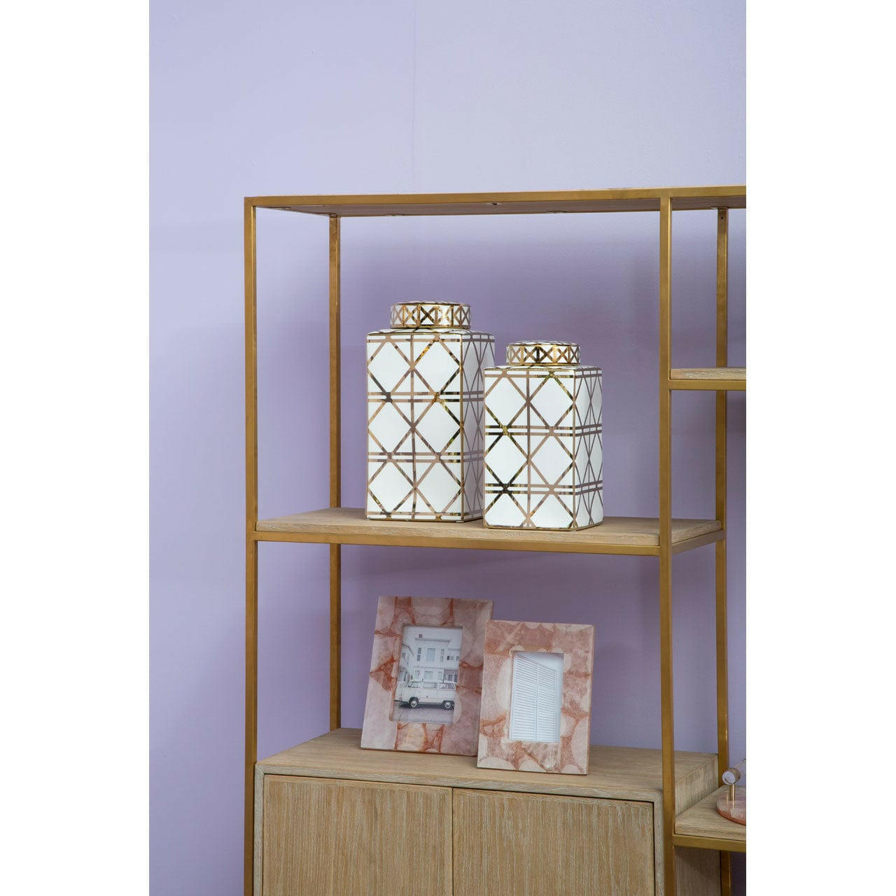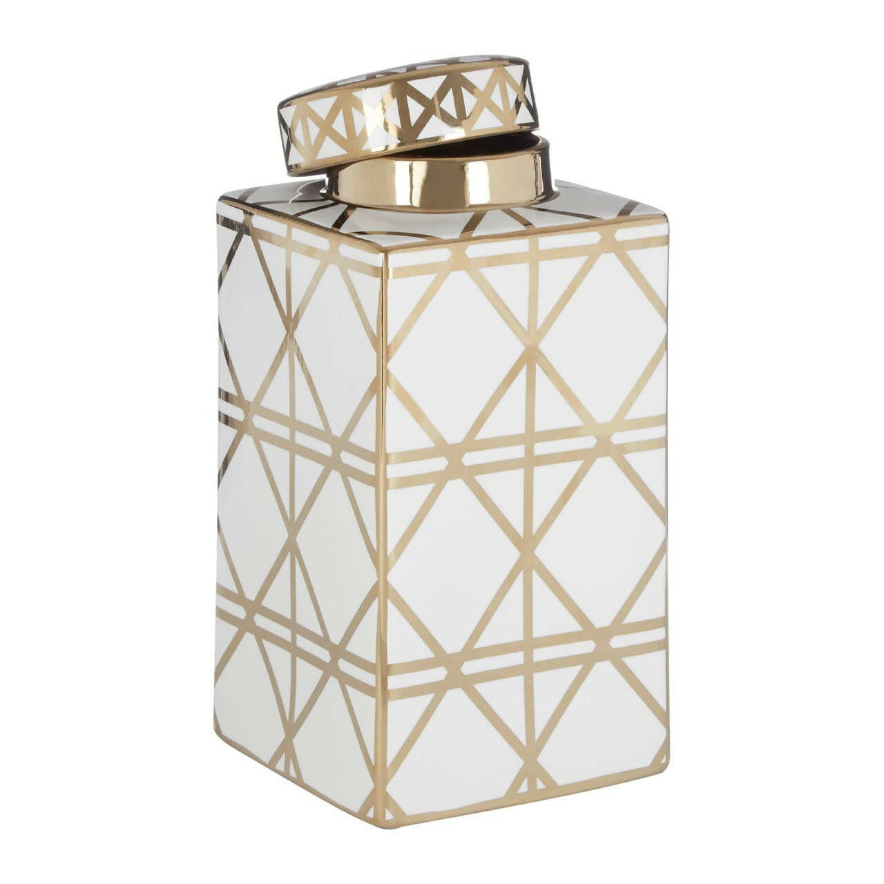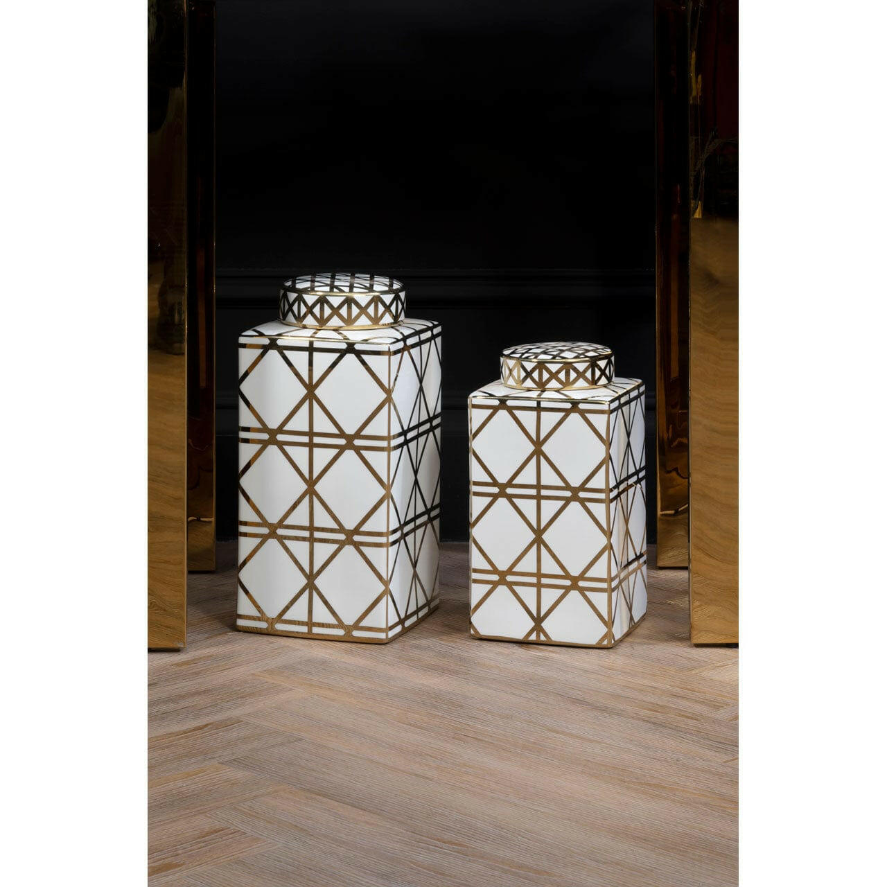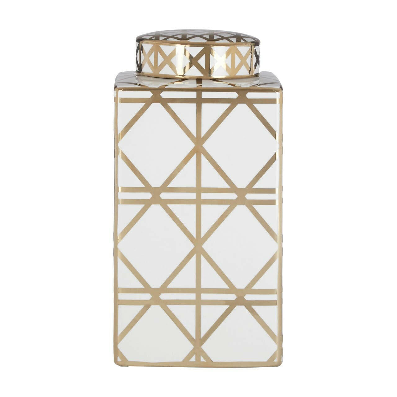 The Kya Small Ceramic Jar from Hamilton Interiors is a stunning addition to any home. Its crisp white finish is complemented by a gold geometric pattern, evoking the glamour of art deco. This small jar measures H31 x W16 x D16cm, making it the perfect size for displaying on a shelf or mantel. Add a touch of luxury to your home with this beautiful ceramic jar, available now at House of Isabella. With free UK delivery, it's never been easier to elevate your interior design. Shop our collection of luxurious furniture and decor today.