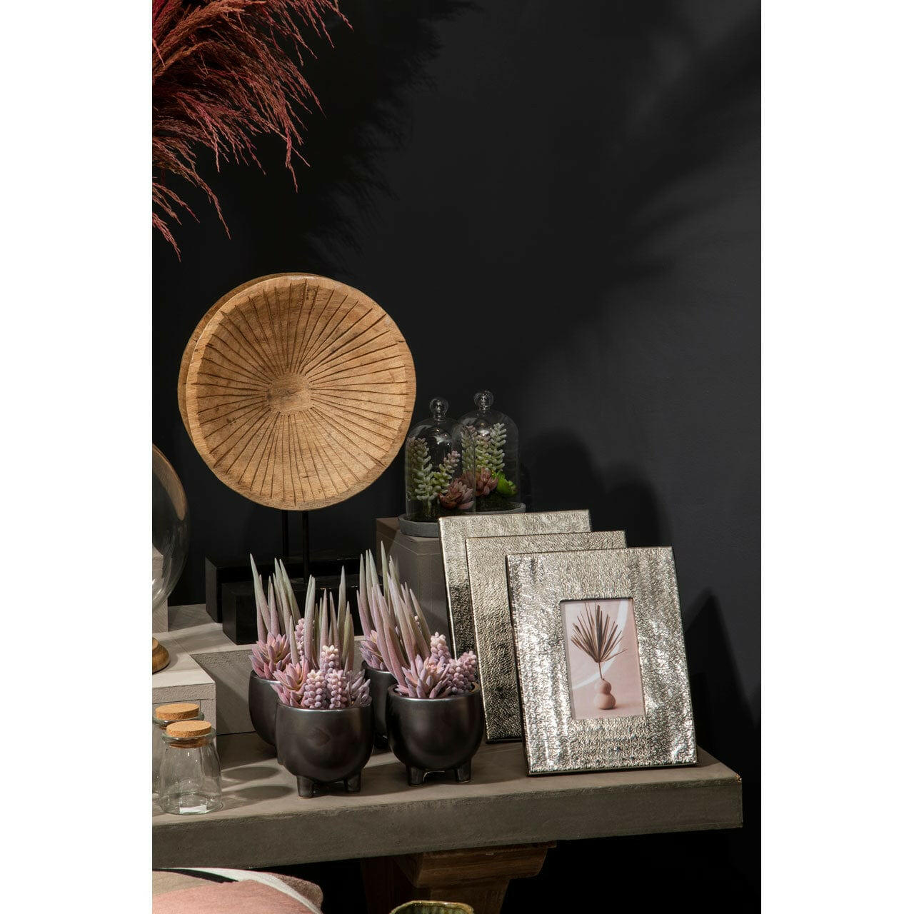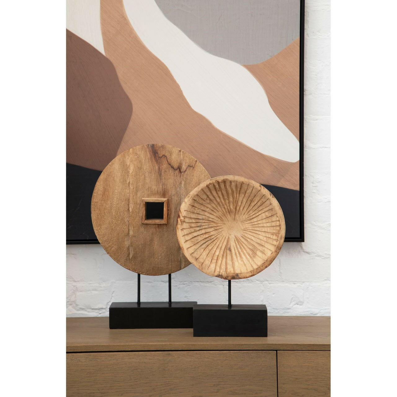 Handcrafted from renewable mango wood, this disc sculpture has a chiseled pattern on its concave surface. Standing on a rectangular plinth made from black iron, a slender stem rises up to support the disc. This beautiful decorative object will create a focal point wherever it is placed, and will style easily with other natural wood accessories and home furnishings. *This item is handcrafted so please expect slight variations to the finish*