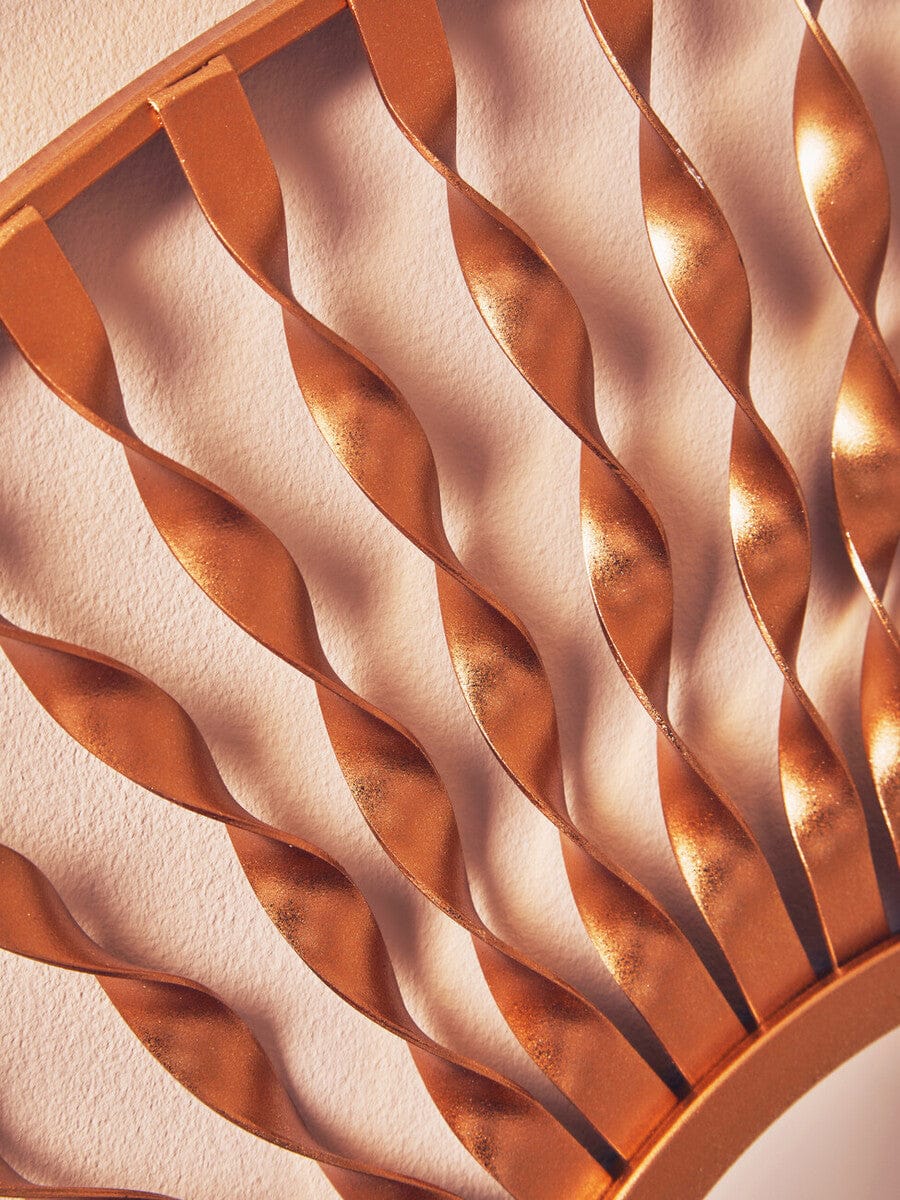 This eye-catching round wall mirror features a radiant gold metal frame with a dynamic sunburst design. Its unique and twisted pattern creates a bold statement, making it an ideal focal point for any living space, adding a warm, inviting touch.