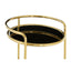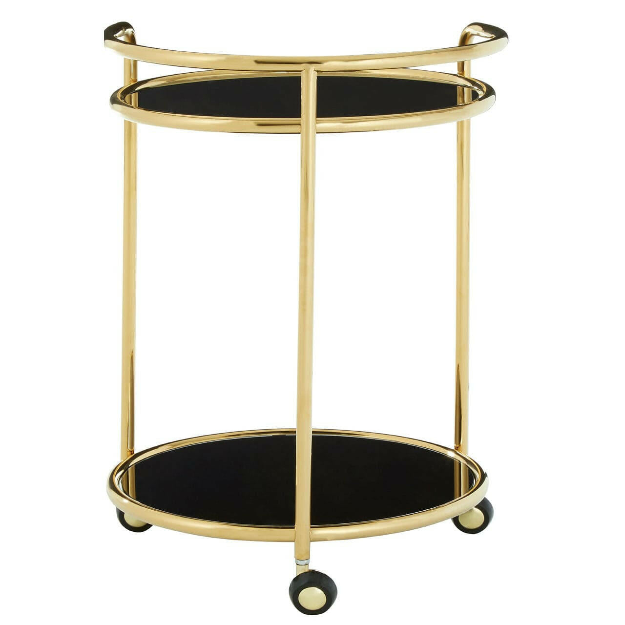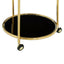 Introducing the Novo Round Gold Finish Trolley, a luxurious addition to any home. Made from smooth steel, this trolley features two round tiers supported by a minimal gold frame. The circular shelves are made from tempered glass with a sleek black finish, creating a rich and elegant color palette. With small black wheels, this trolley can be easily moved around for convenience.