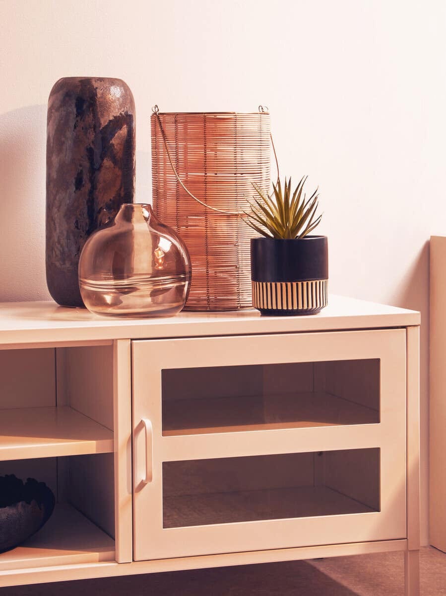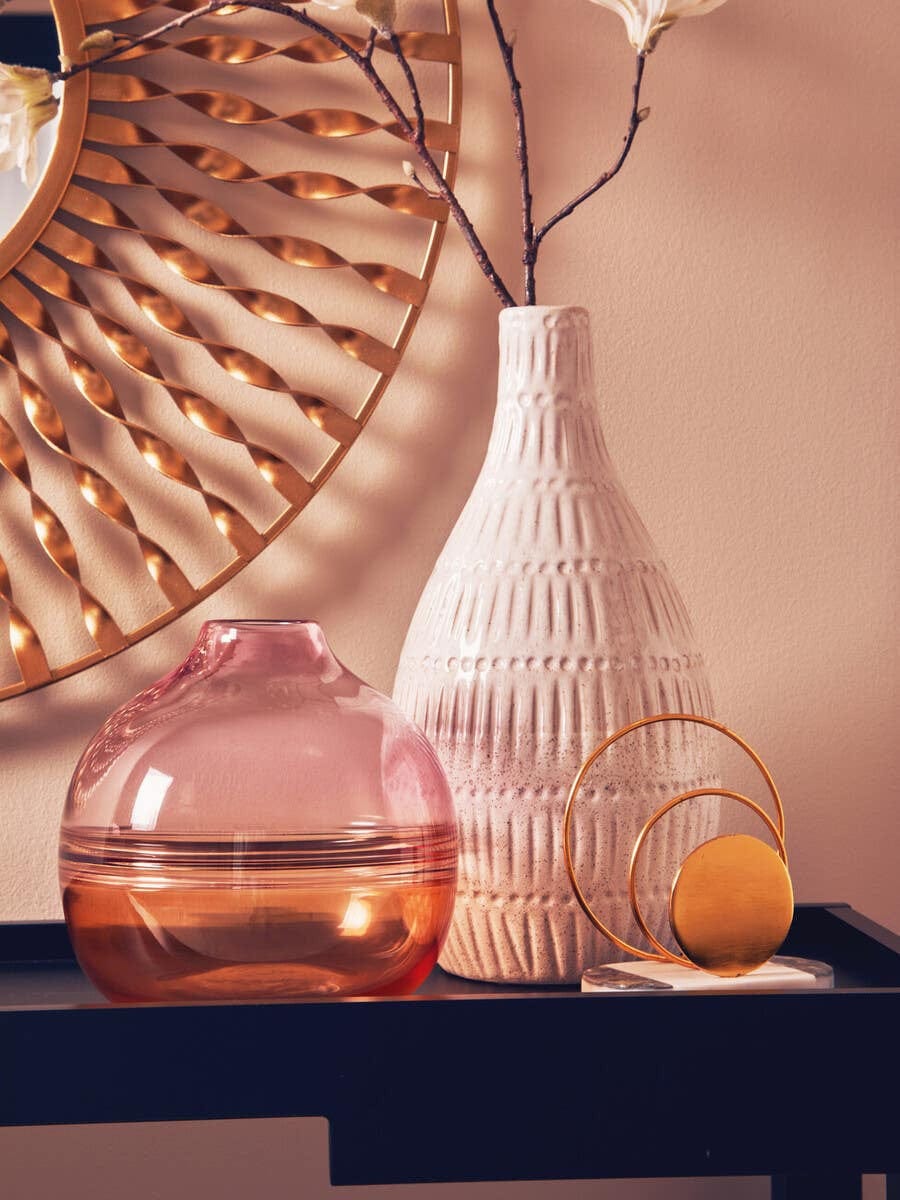The Optik yellow and pink ombre glass vase has a series of indented rings in the middle of the surface which creates a ribbed effect. The vase has a bottleneck and will add a touch of texture and visual interest to a mantel or shelf.