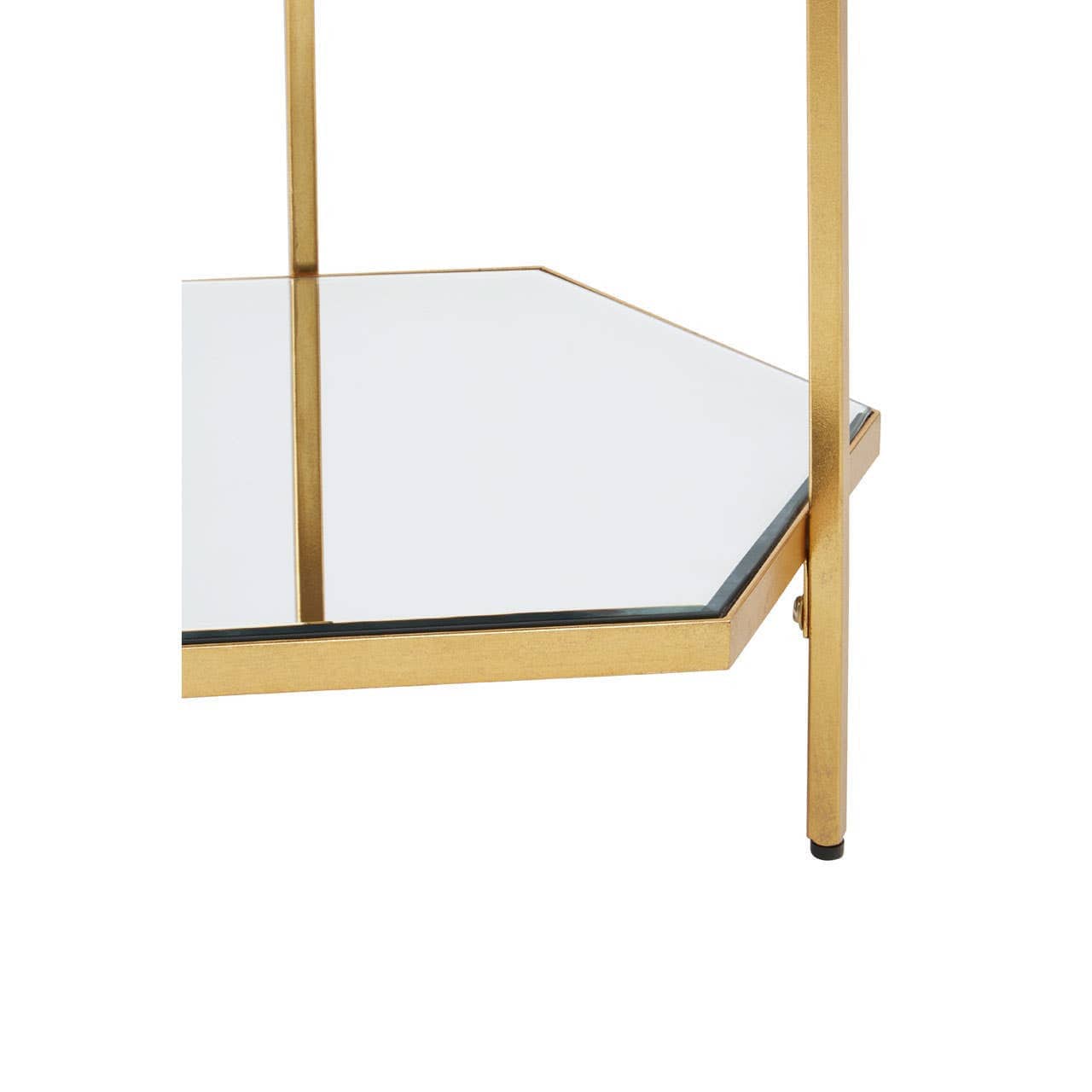 This side table is completed with two hexagonal mirrored glass tiers that neatly sit within their respective rims. Each of these mirrored surfaces add to the reflective appeal of this luxe-inspired accent piece.