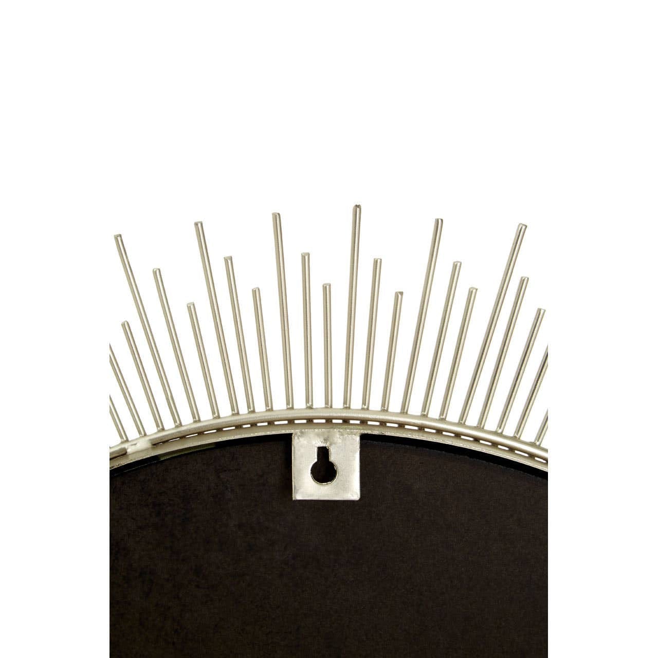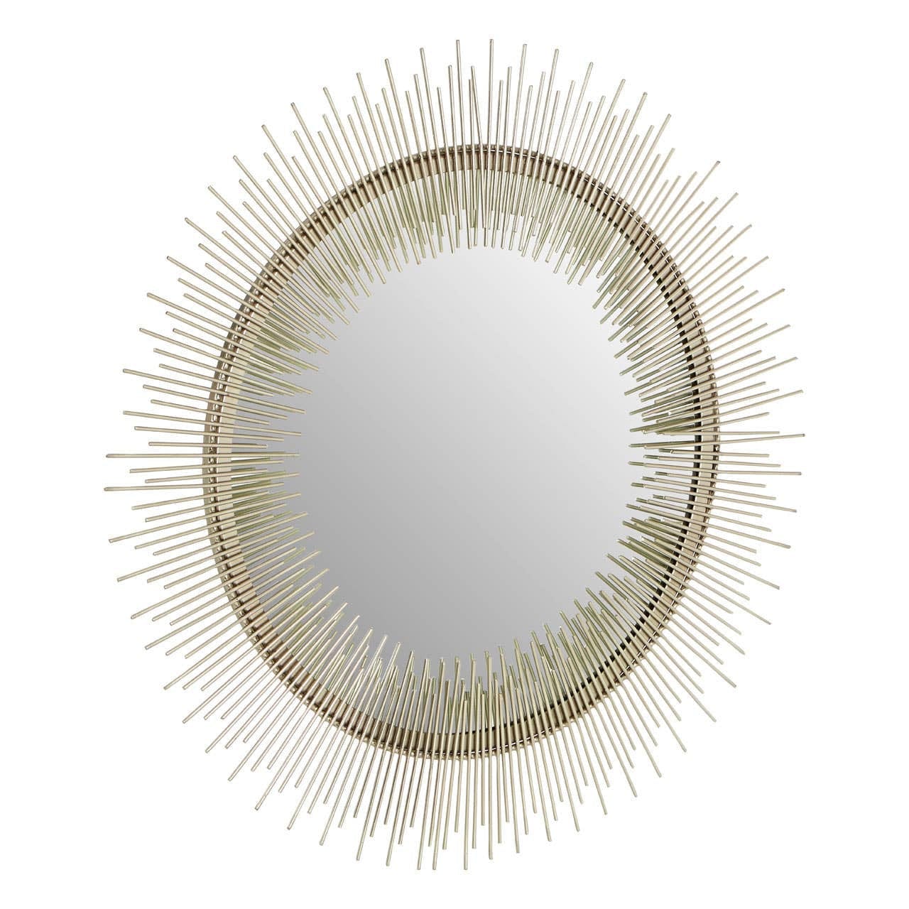 Its round frame is made from iron and has a silvery pewter finish. Thin golden cylindrical lines are positioned around the frame, extending across the reflective surface and outwards to produce a dazzling sunburst effect.