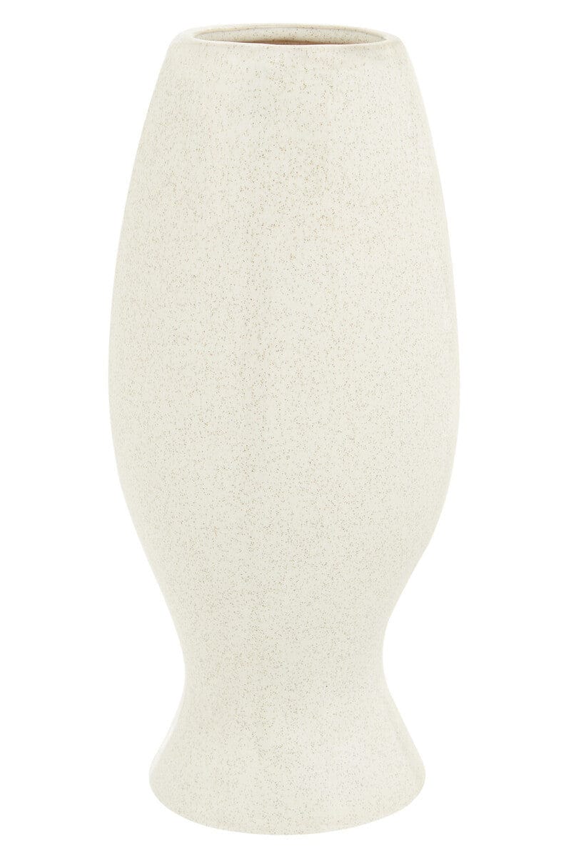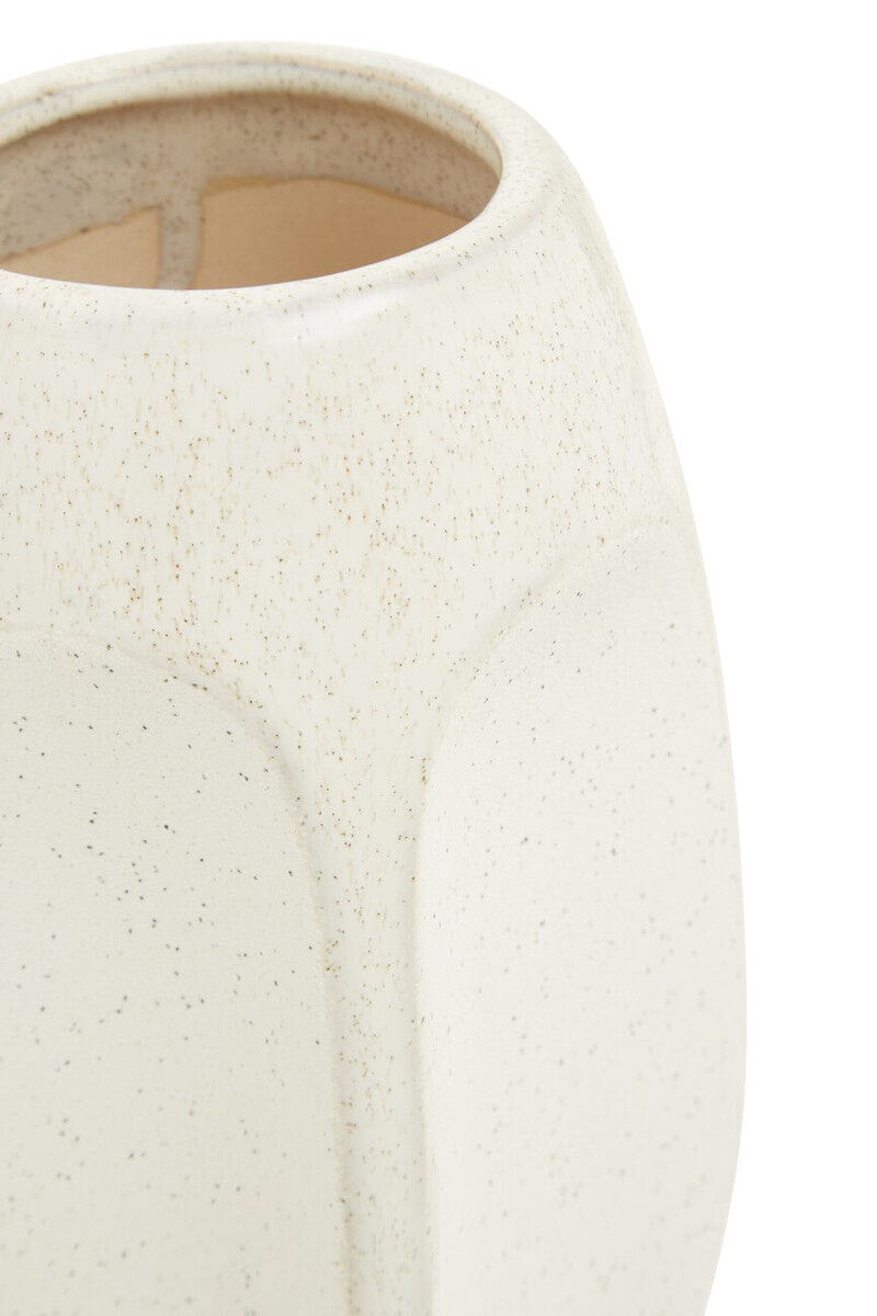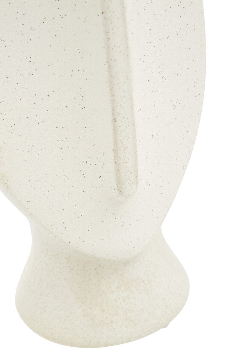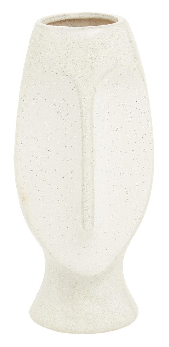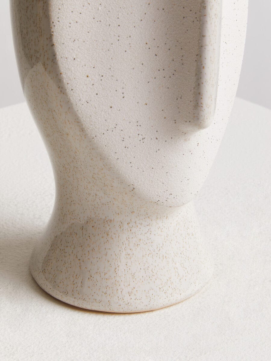 Handcrafted from robust stoneware, the large Viso vase is carved into a face sculpture and has a beige finish that accentuates the features and texture influenced by modern art.