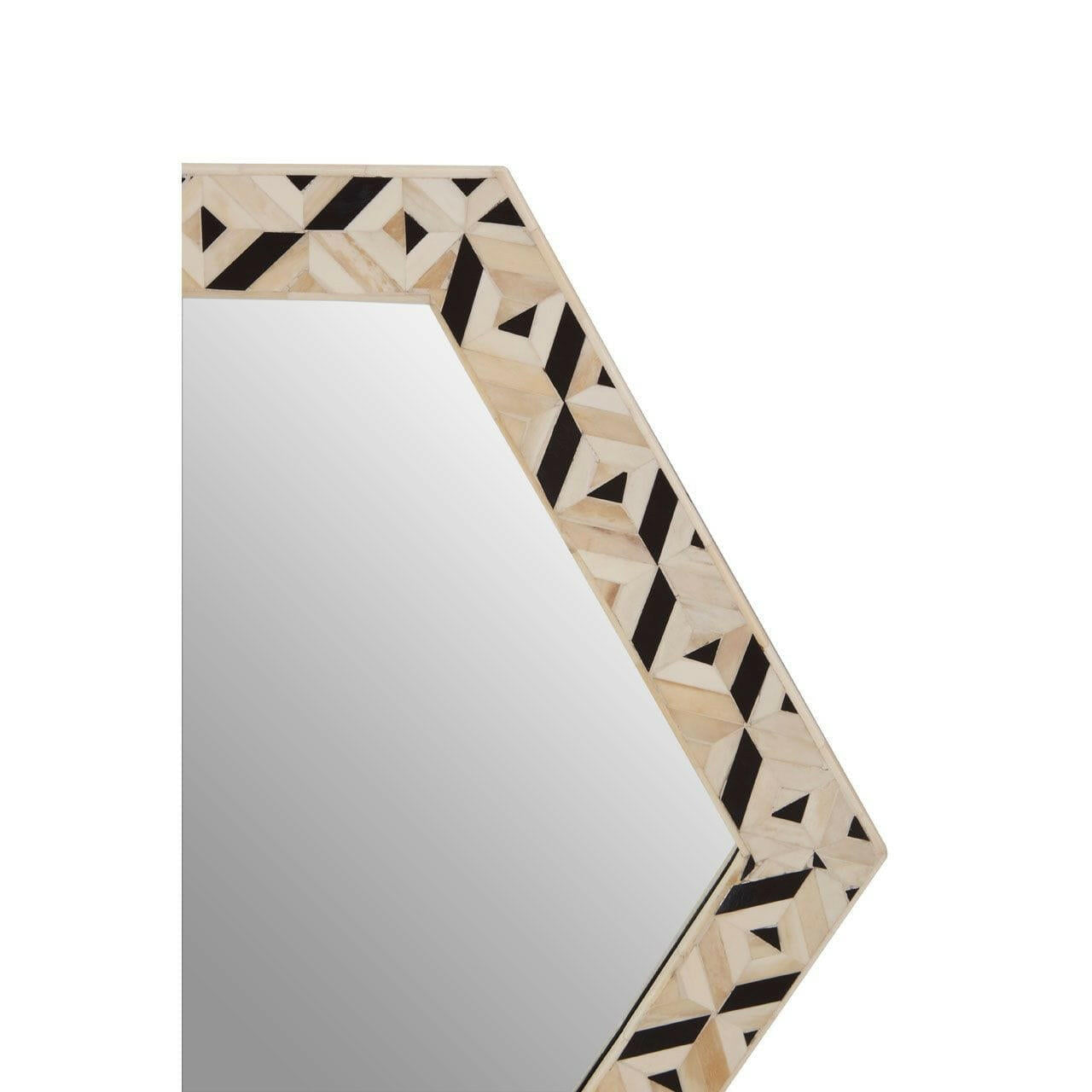 Made from resin, this wall mirror has a hexagonal frame featuring a distinctive geometric pattern in tonal black, ivory and cream. Style with Harlo orbs, tray and bookends for a coordinating look.