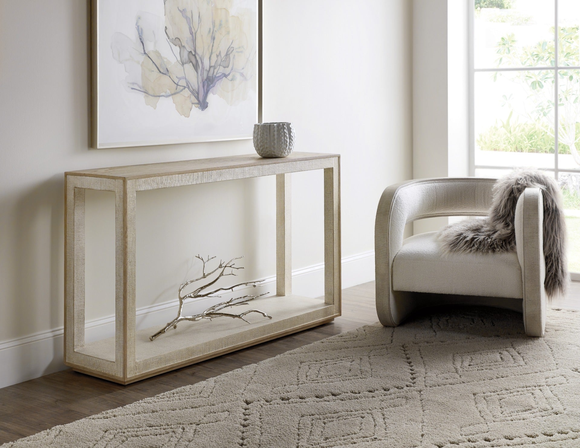 Elevate your hallway, living room, or entryway with the Hooker Furniture Cascade Console Table — a beautifully crafted accent piece that marries organic texture with refined architectural form. Designed with a solid wooden frame and matching wooden top, this console table exudes natural warmth, while the signature grasscloth-textured detailing inset into the frame introduces subtle depth and tactile allure. The harmony of clean lines and layered surface treatments makes it an ideal choice for contemporary, transitional, or modern interiors.
