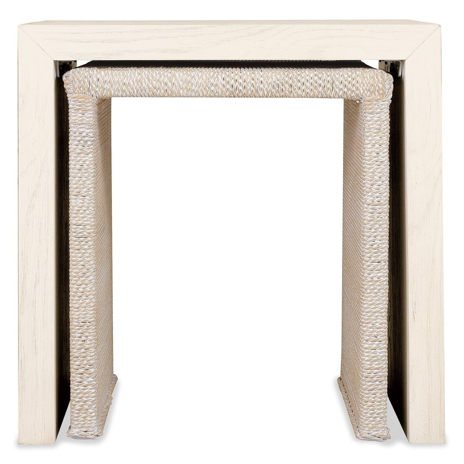 The Hooker Furniture Harmony Nesting Tables bring versatile surface space and natural texture to living rooms, lounges, or seating areas. This set of two nesting tables features a smaller table wrapped in woven rope and a larger table crafted from pine wood, both with a clean, refined silhouette. The smaller table slides neatly beneath the larger one, offering compact or expanded surface arrangements as needed. The combination of natural materials and tactile contrast delivers understated elegance for everyday use and entertaining.