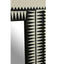 The mirror's frame is decorated by a geometric, tribal-style pattern comprised of slender black and white triangles.