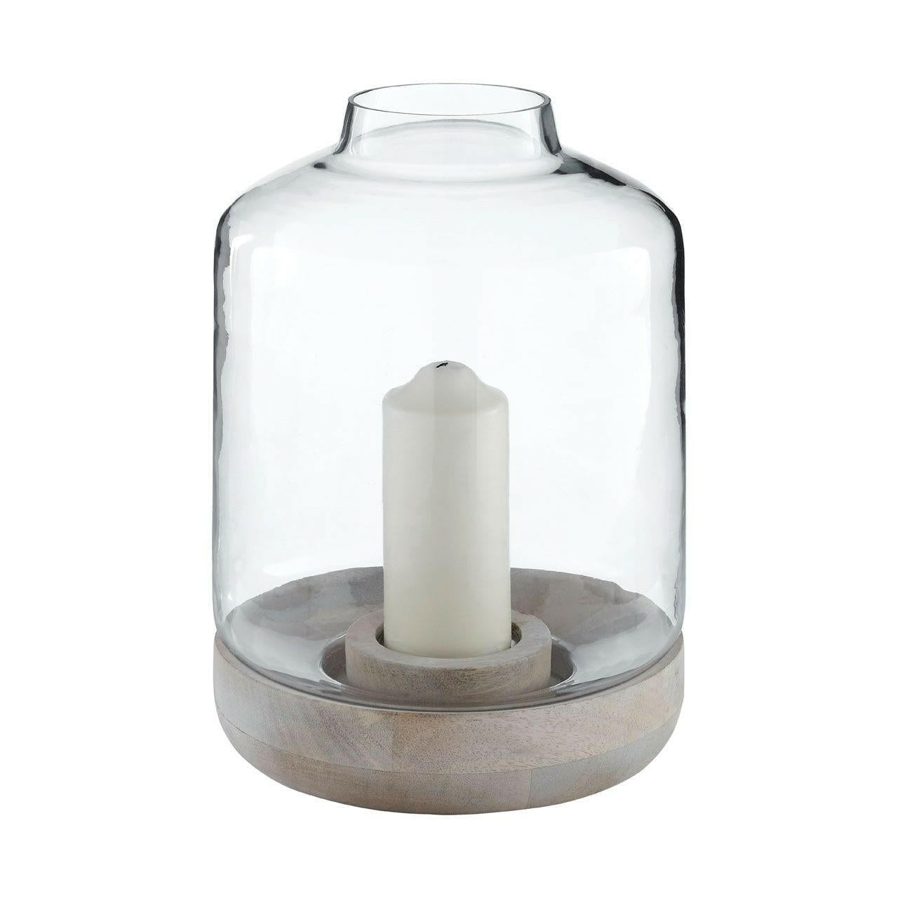 Its removable shade is made from clear glass and has a bottle neck that accentuates its tapering shoulders. The base is made from sustainable mango wood with a small plinth at the centre designed to hold a pillar candle. The subdued tones of this handcrafted accent piece make it suited to cool Nordic interior design settings. *This item is handcrafted so please expect slight variations to the finish*