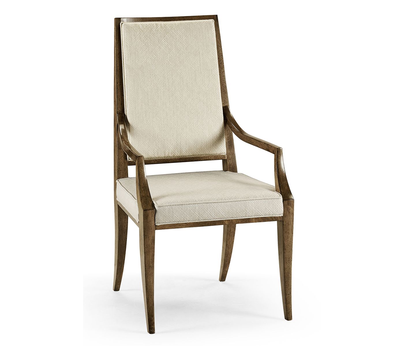 Barcelona Arm ChairSculpted from American walnut, with a transparent, hand rubbed finish. This chair is upholstered in a Jonathan Charles performance fabric Skipper. Barcelona CollectionInterpreting classic forms through a modern lens, Barcelona celebrates the interplay of beautiful veneer work, stunning finish techniques and master metalwork in stainless steel with a champagne finish. The shaping of the case and seating designs reflect an appreciation for a traditional aesthetic while still referencing the luxury of traditional styling.Jonathan Charles FurnitureAt Jonathan Charles, it's all in the detail. Renowned for exquisite quality and specialist artistry, Jonathan Charles excel in designing fine furniture and high-quality antique reproductions inspired by the classics of the past. Jonathan Charles Furniture is made entirely by hand using age-old techniques employed by specially trained artisans. it'sthis craft and attention to detail that breathes character and long-lasting quality into every furniture piece, successfully imitating antique heirlooms from the past.