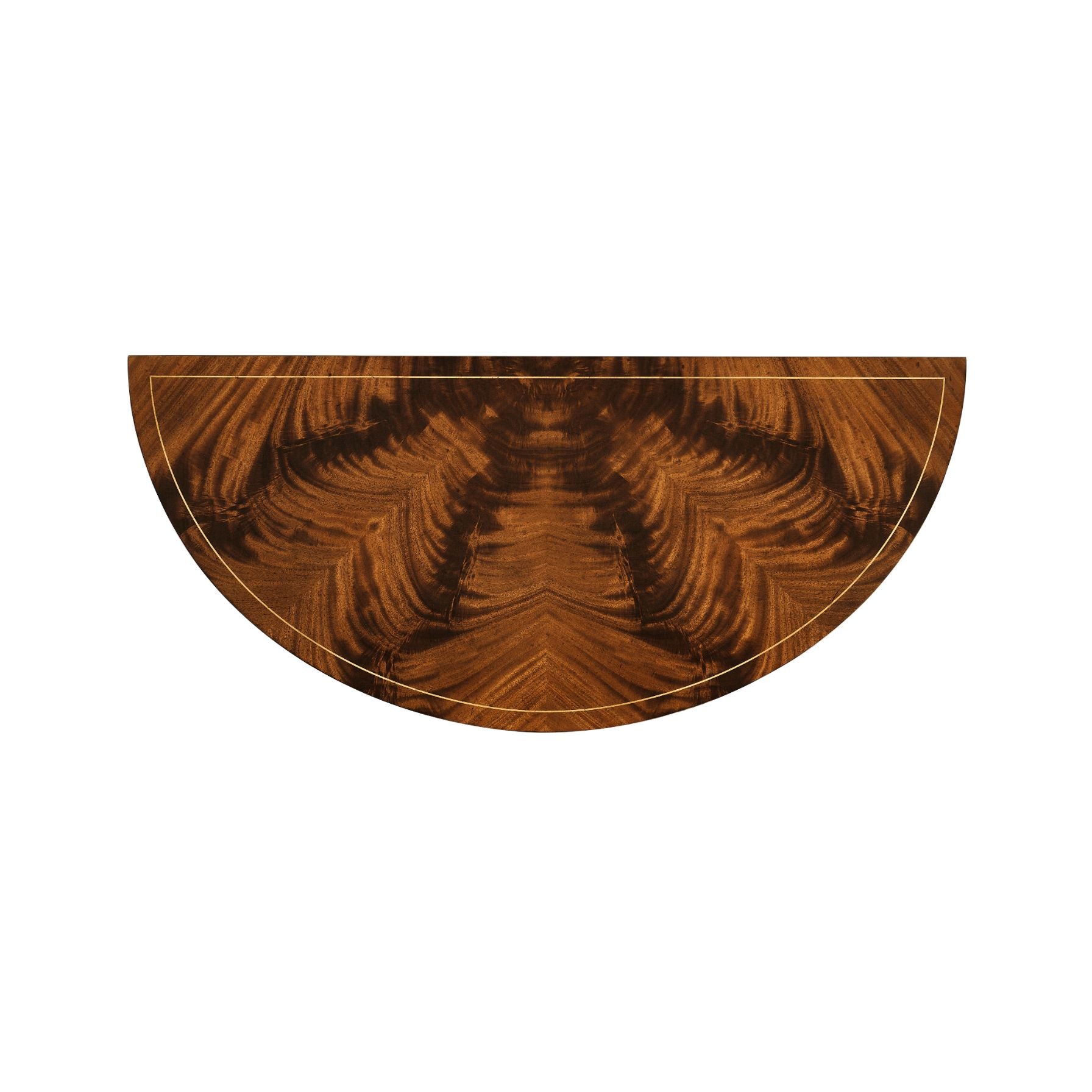 Biedermeier style mahogany demilune cabinetElegant Biedermeier inspired demilune chest of three drawers veneered in crotch mahogany with contrasting stringing inlay raised on tapering sweeping legs with matching inlays. Clean and Classsic CollectionJonathan Charles FurnitureAt Jonathan Charles, it's all in the detail. Renowned for exquisite quality and specialist artistry, Jonathan Charles excel in designing fine furniture and high-quality antique reproductions inspired by the classics of the past. Jonathan Charles Furniture is made entirely by hand using age-old techniques employed by specially trained artisans. it'sthis craft and attention to detail that breathes character and long-lasting quality into every furniture piece, successfully imitating antique heirlooms from the past.