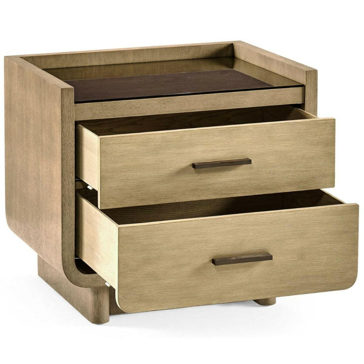 Constructed from American white oak with a lightly textured, ceruse finish. Top displays a bronze glass cover. Pulls are cast from brass with a deep, rich patina. Cabinet features one pull out shelf.