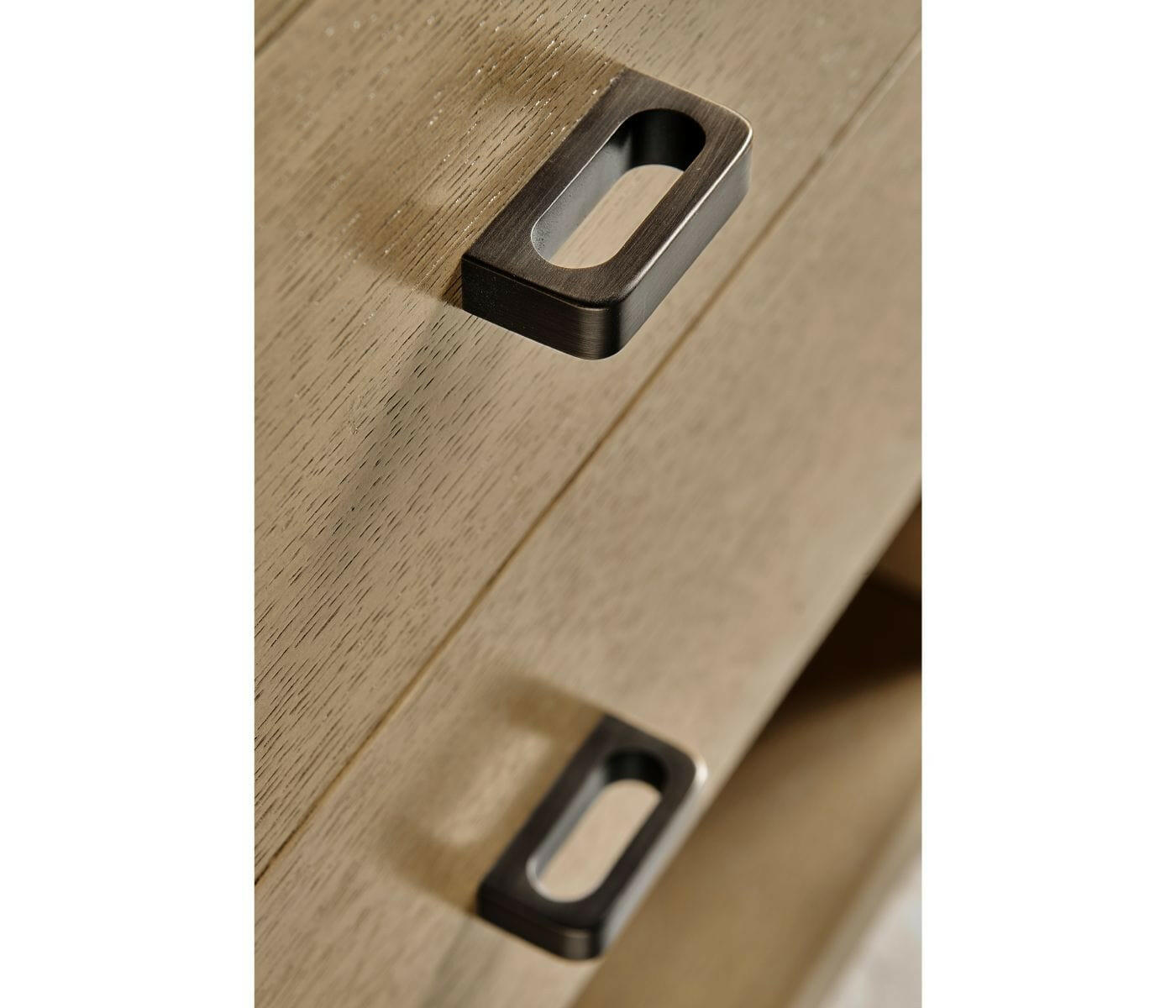 Built from American white oak with a lightly textured, ceruse finish. Pull is cast from brass with a deep, rich patina. Cabinet includes one pull out shelf.