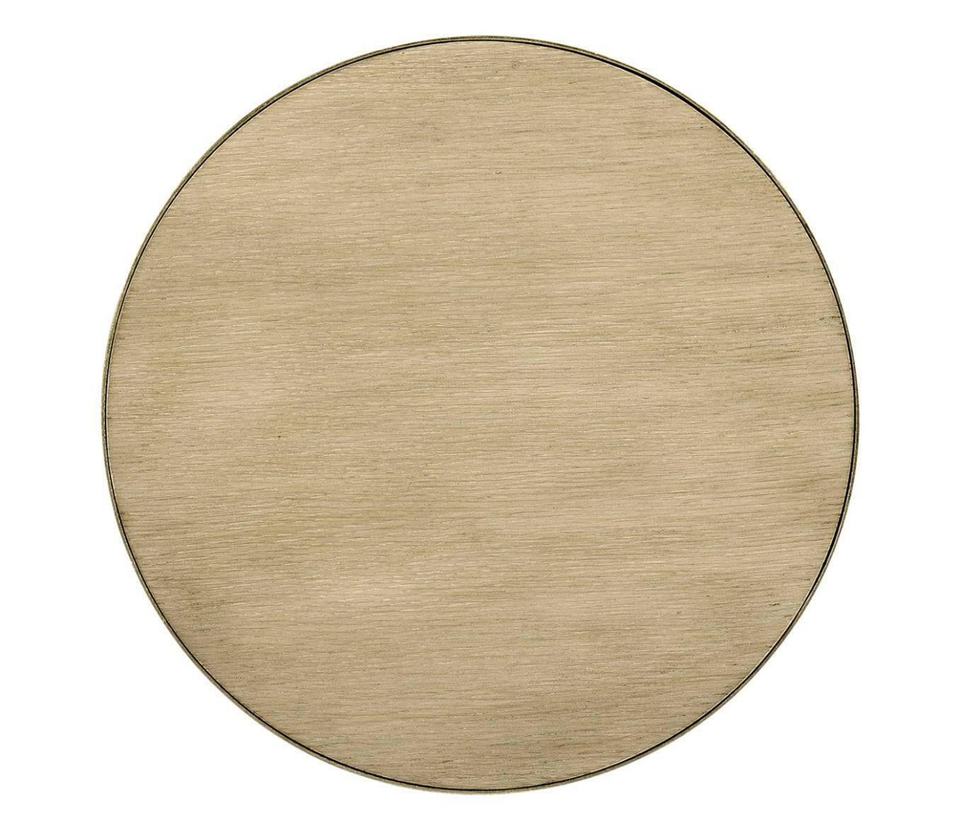 Top features American white oak with brass trim. Column is brass with a natural, mottled finish. Base is faux marble.