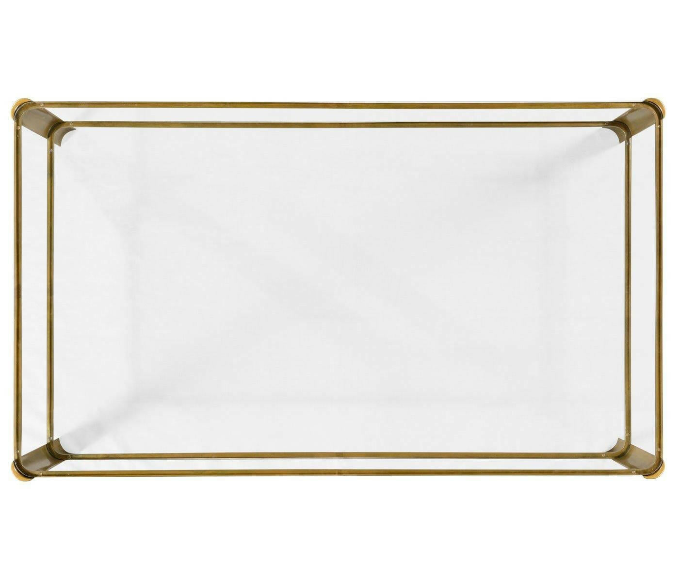 Contemporary styled patinated lacquered brass and glass rectangular coffee table with two tiers and legs set on an angle. Inspired by French avant garde design of the 1920s.