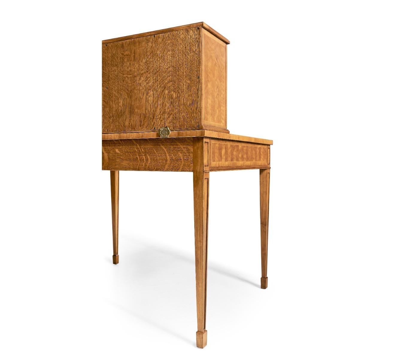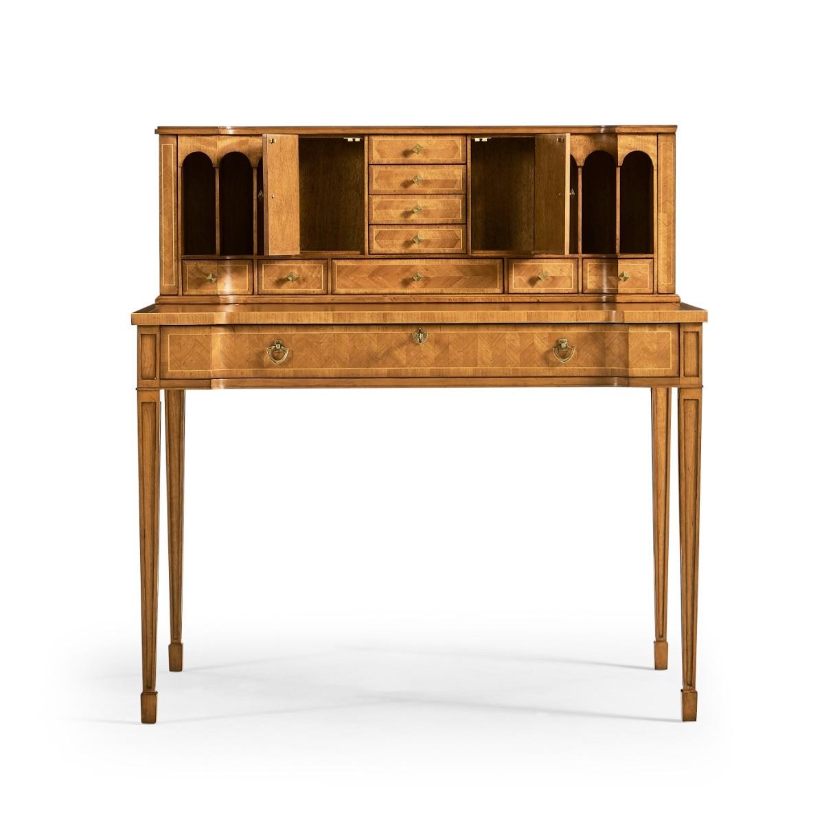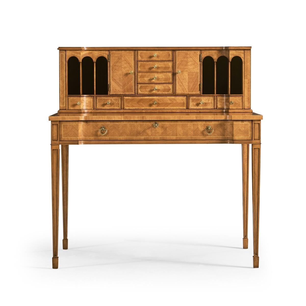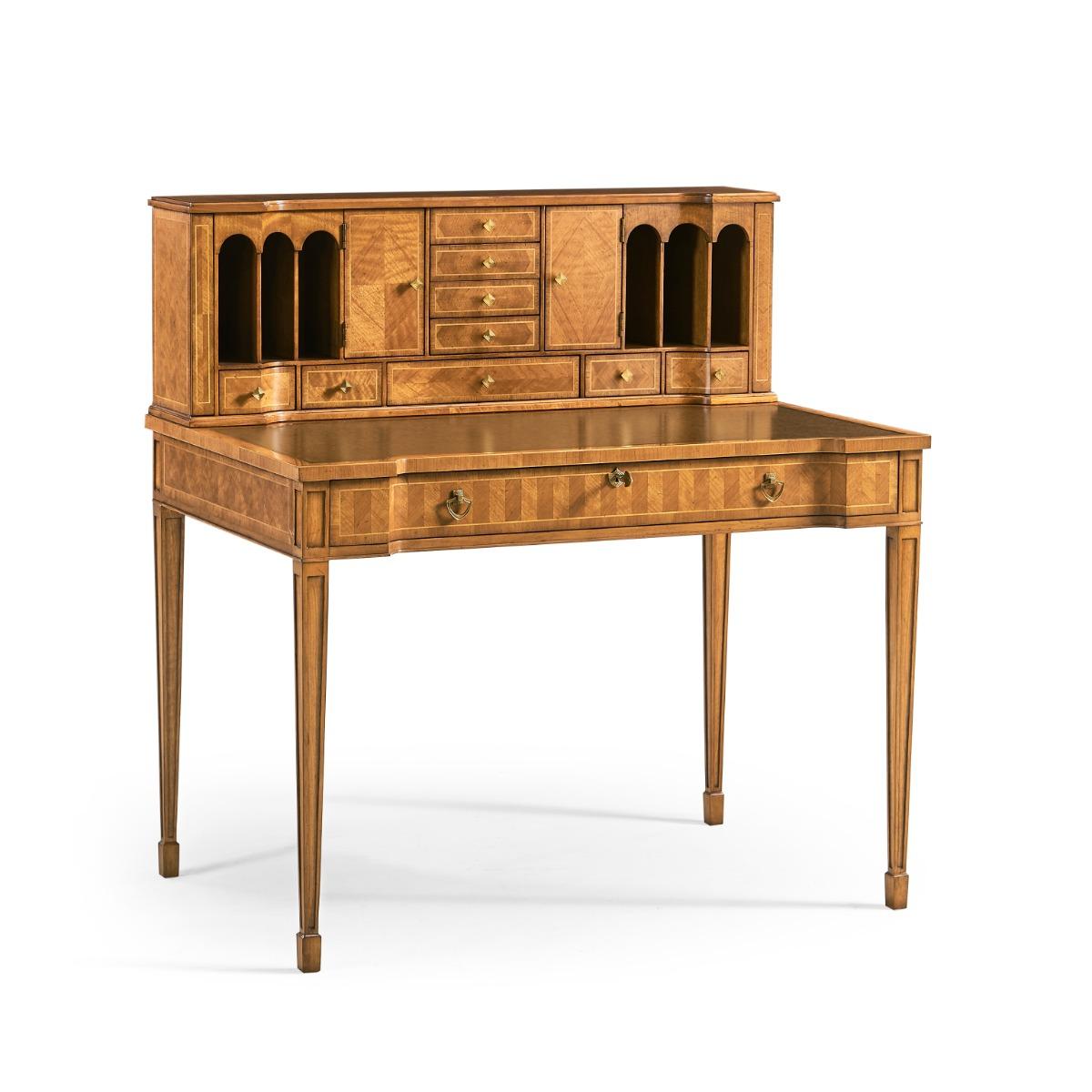 Satinwood bonheur de jourElegant satinwood contrast veneered bonheur de jour with an inset leather writing surface and an arrangement of drawers and shelves to the superstructure. Finely cast brass handles throughout. Versailles Collection Jonathan Charles takes opulence a step further with the Versailles Collection, which embraces the drama and embodies the regality of the 18th century, Louis XV-era Versailles. Drawing inspiration from various influential tastemakers at court, each design in the Versailles Collection demands attention and exudes extravagance. Jonathan Charles Furniture At Jonathan Charles, it's all in the detail. Renowned for exquisite quality and specialist artistry, Jonathan Charles excel in designing fine furniture and high-quality antique reproductions inspired by the classics of the past. Jonathan Charles Furniture is made entirely by hand using age-old techniques employed by specially trained artisans. it's this craft and attention to detail that breathes character and long-lasting quality into every furniture piece, successfully imitating antique heirlooms from the past.