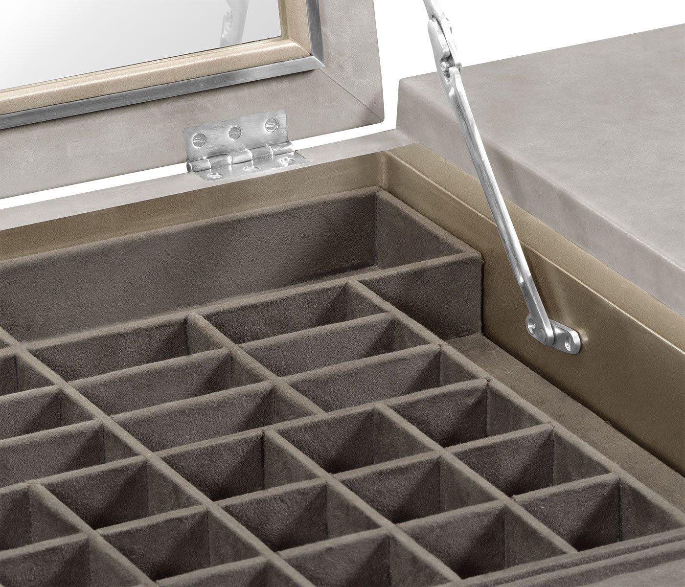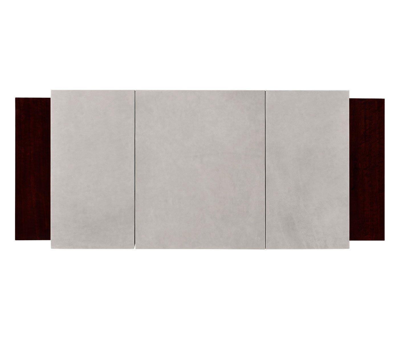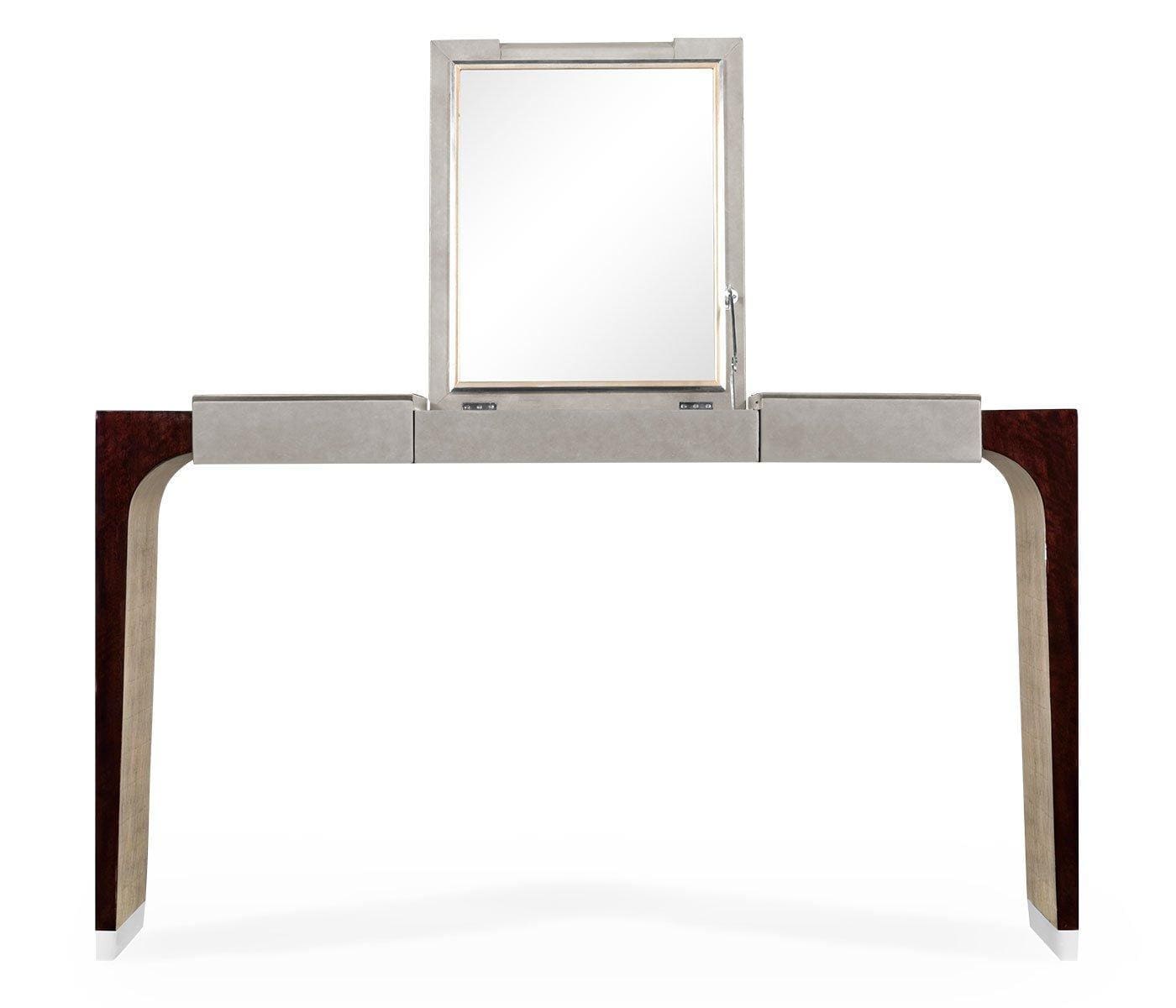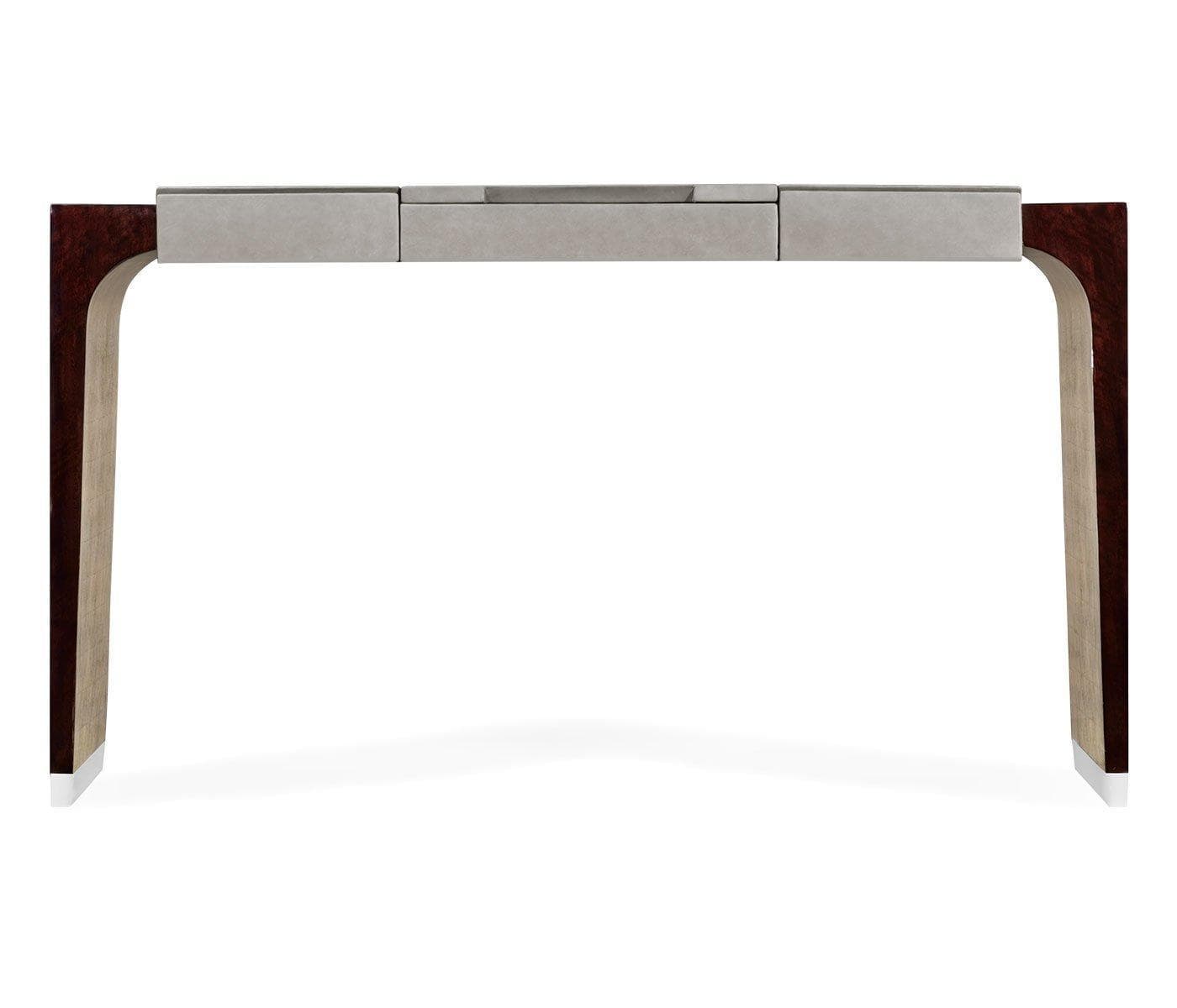 Dressing table in black eucalyptus with grey leather and stainless steel detailing, including a centre drawer.At Jonathan Charles, it is all in the detail. International experts in designing and manufacturing fine furniture, Jonathan Charles craft beautiful antique reproductions using age-old techniques employed by specially trained artisans, breathing character and long-lasting quality into their furniture and accessories.