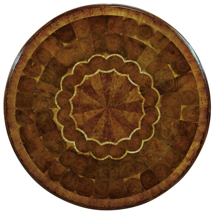 Walnut and oyster veneer lamp table with fine decorative veneers on the top and sides on a shallow carved tripod base with patinated brass collar detail.