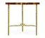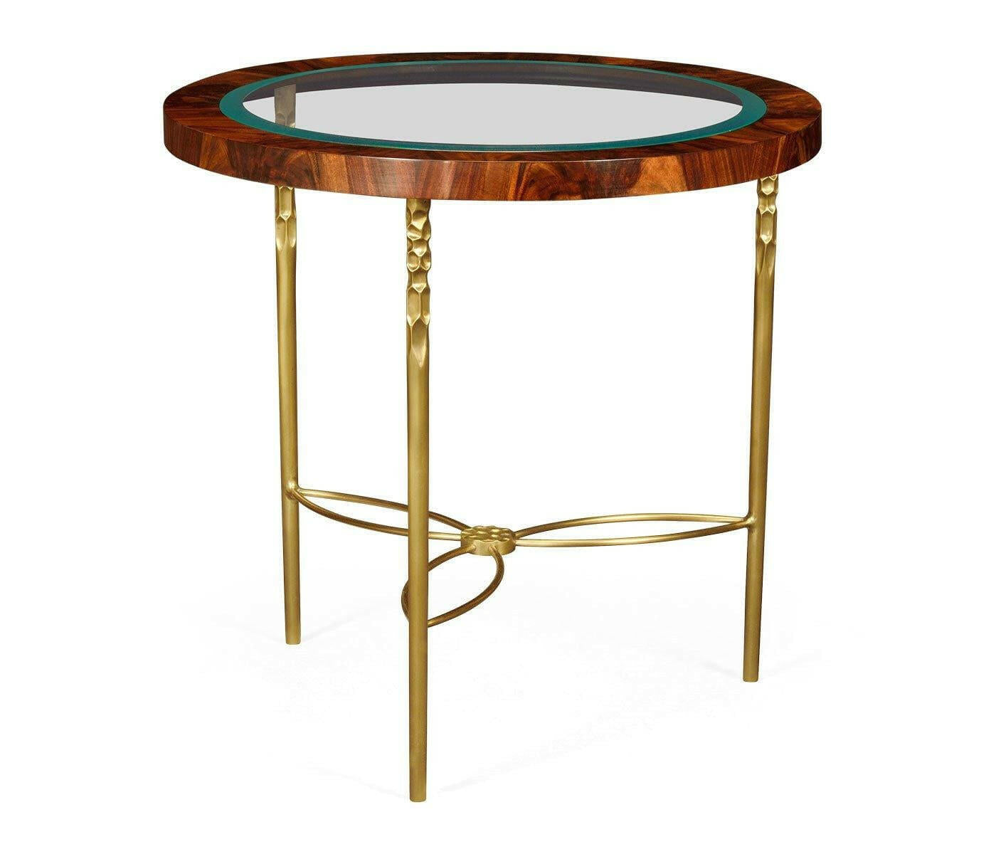 Round side table in Tropical walnut crotch with glass top set above brass legs and an openwork base.