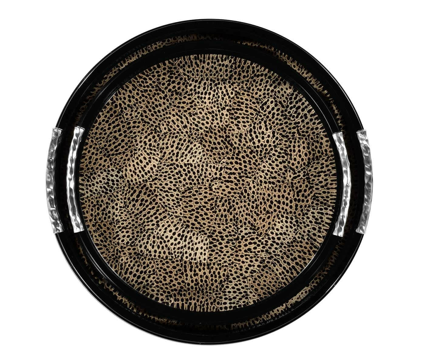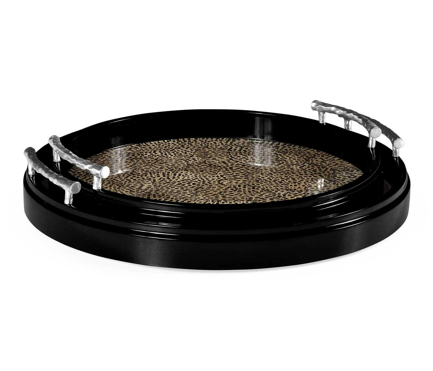 Duo circular tray in black midnight snakeskin eggshell inlay with stainless steel handles.
