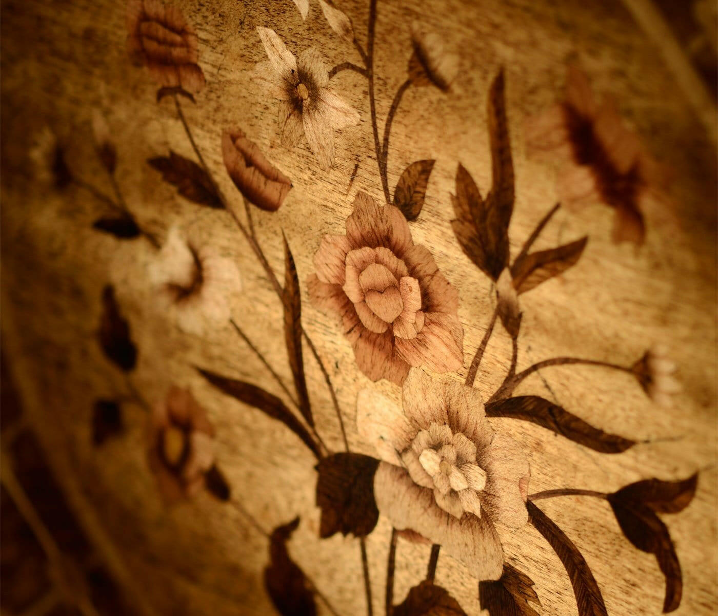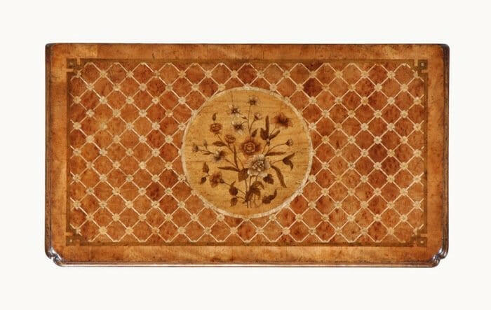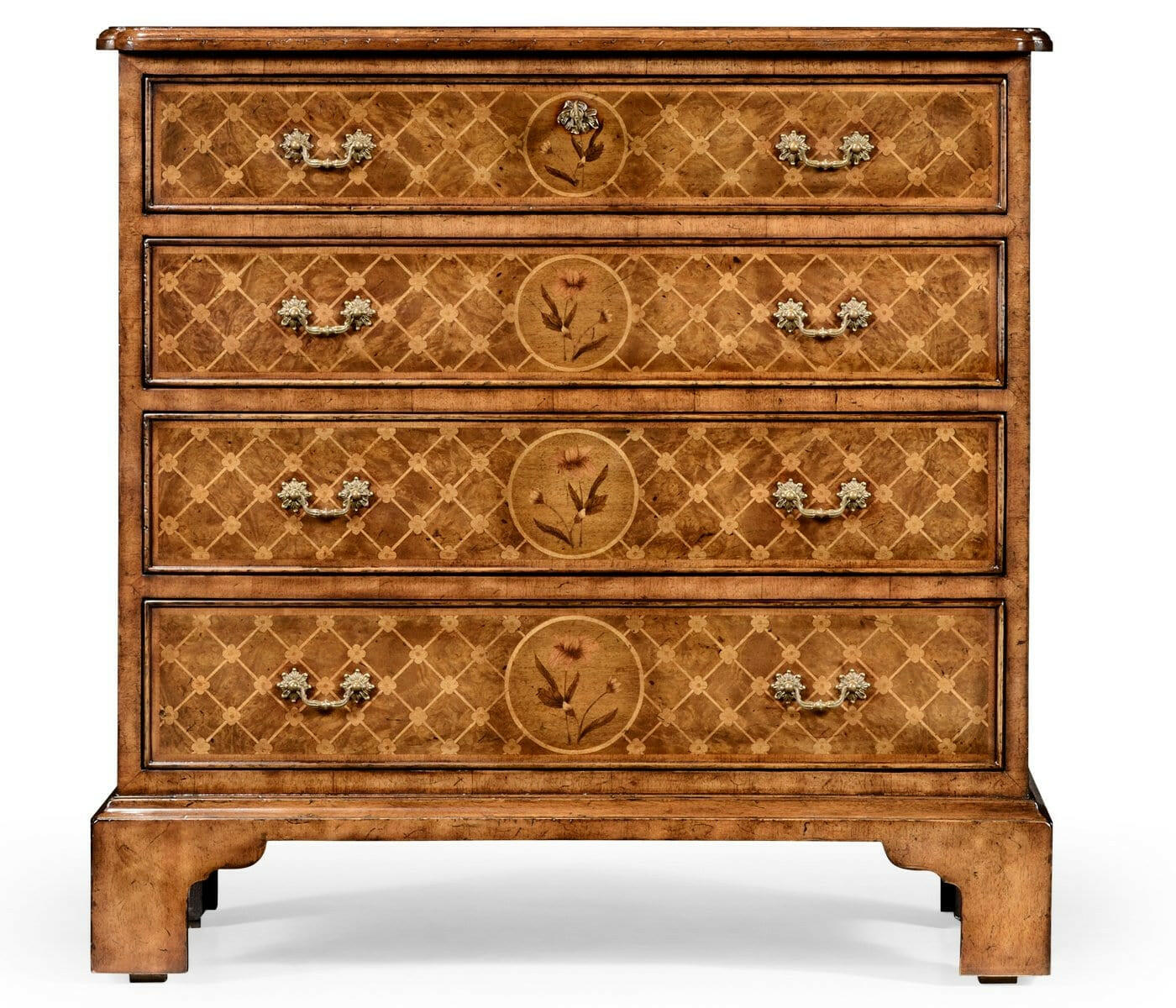 Floral maquetry & parquetry small chest of drawers , part of the Windsor collection by Jonathan Charles , is decorated with intricate and complex designs, after an origional of the mid 18th Century. This would make a lovely bed side chest for a guest room.