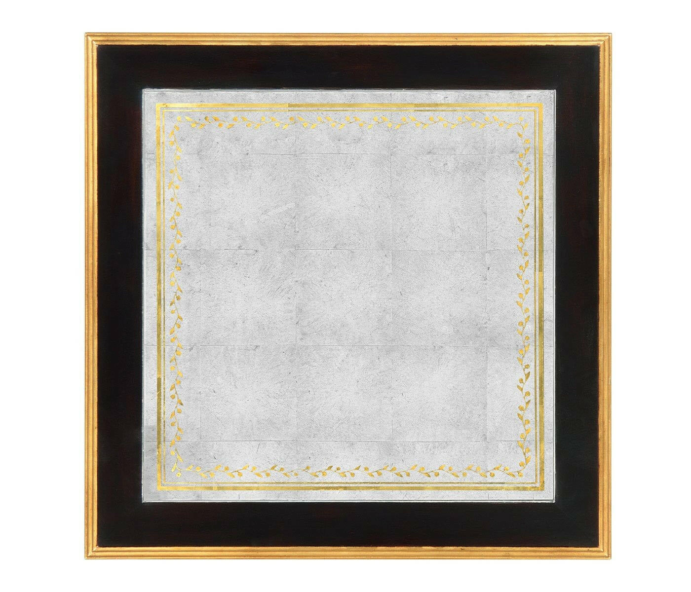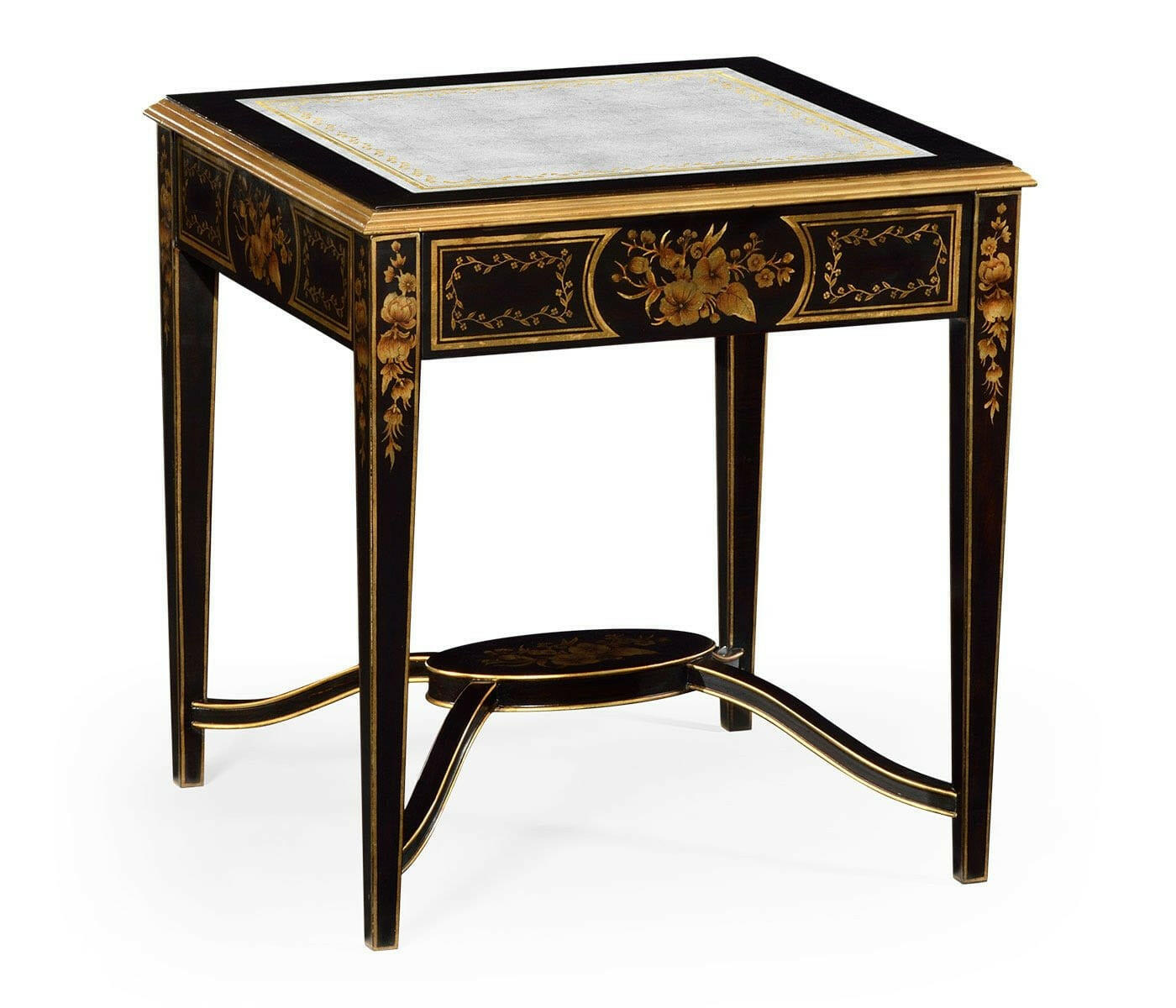 Decorative hand painted black and gilt square side table with silver-leaf églomisé glass top and running floral motifs to the side panels, drawer and tapering legs, above curved raised stretchers around an oval cartouche designed for a vase.