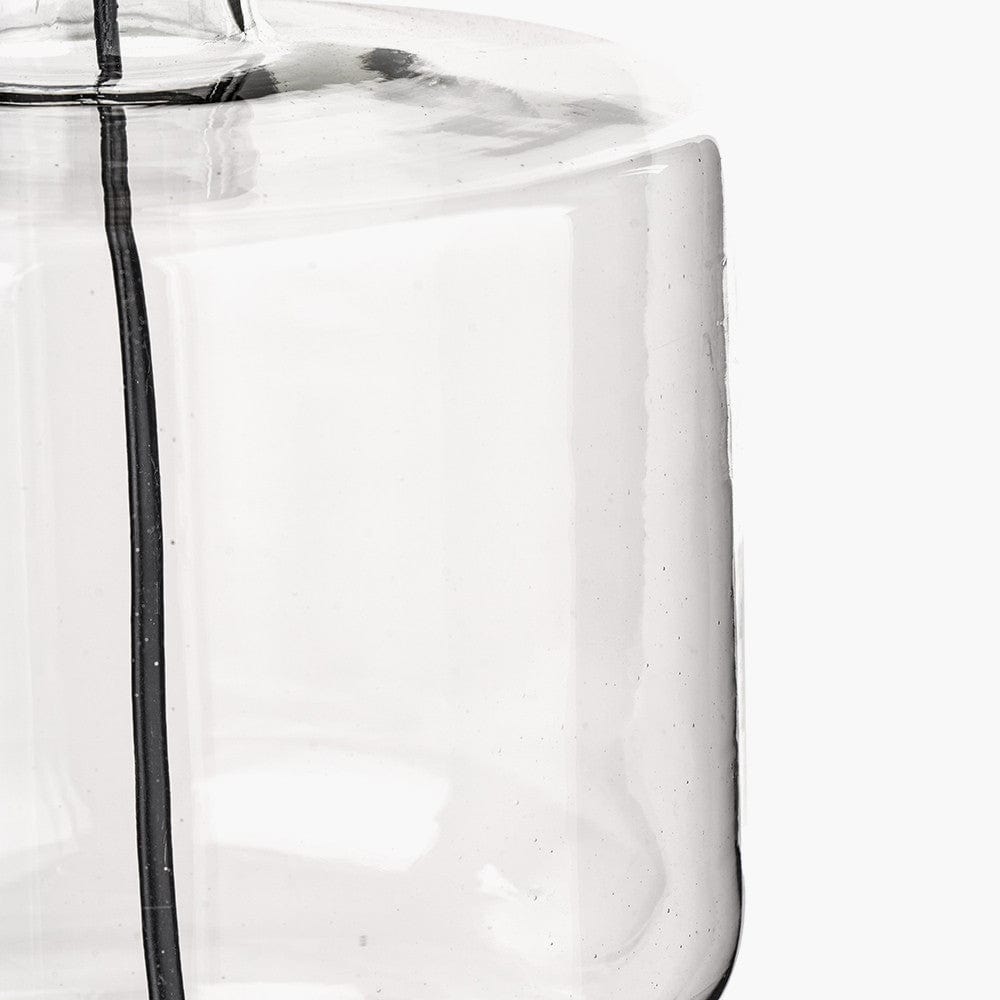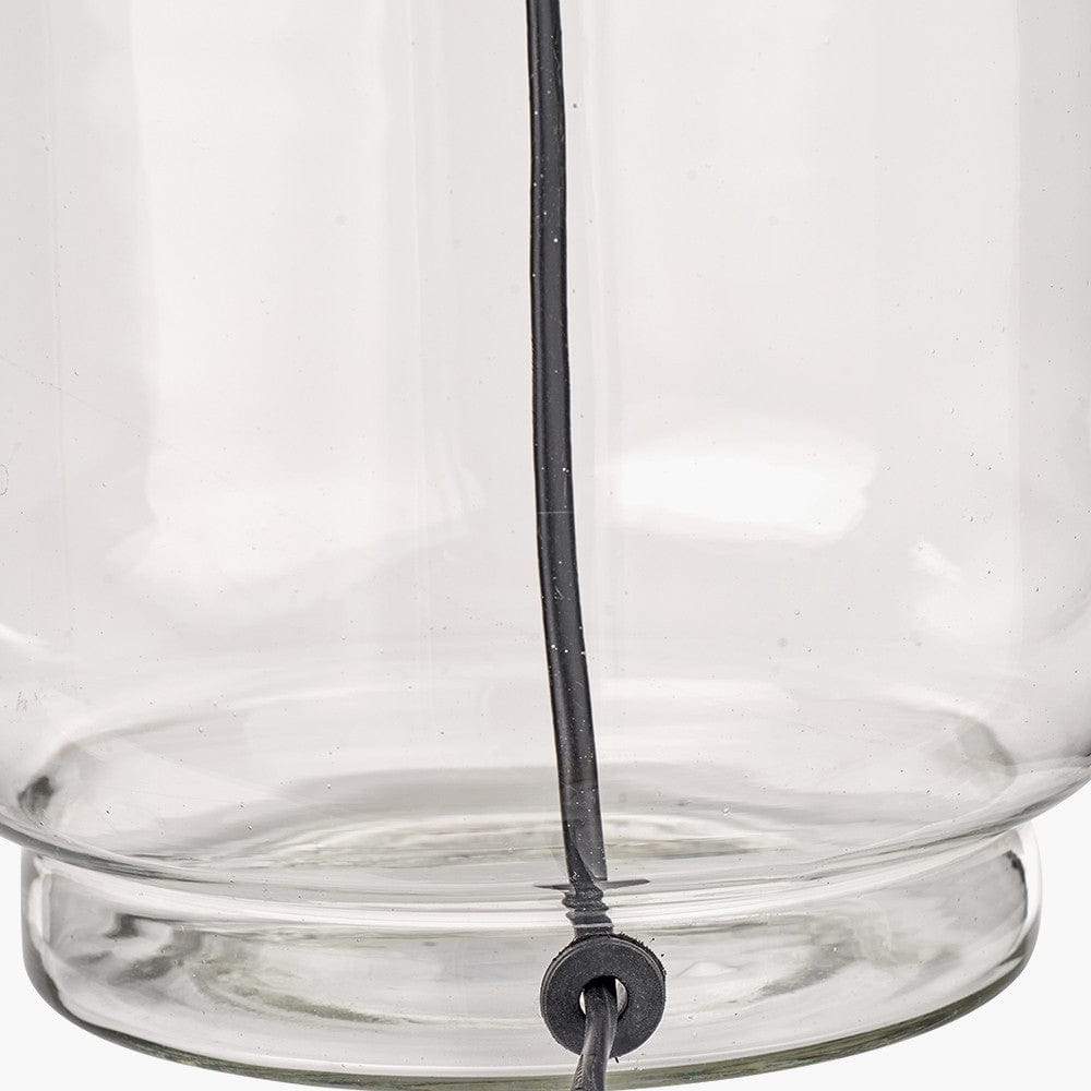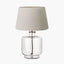 The perfectly proportioned, clear glass table lamp is crafted in India and complemented by contrasting antique brass metal base detailing. The beautiful lamp base is topped off perfectly with a slubby cotton, softly tapered, shade in a natural cream hue. A purists dream lighting combination