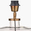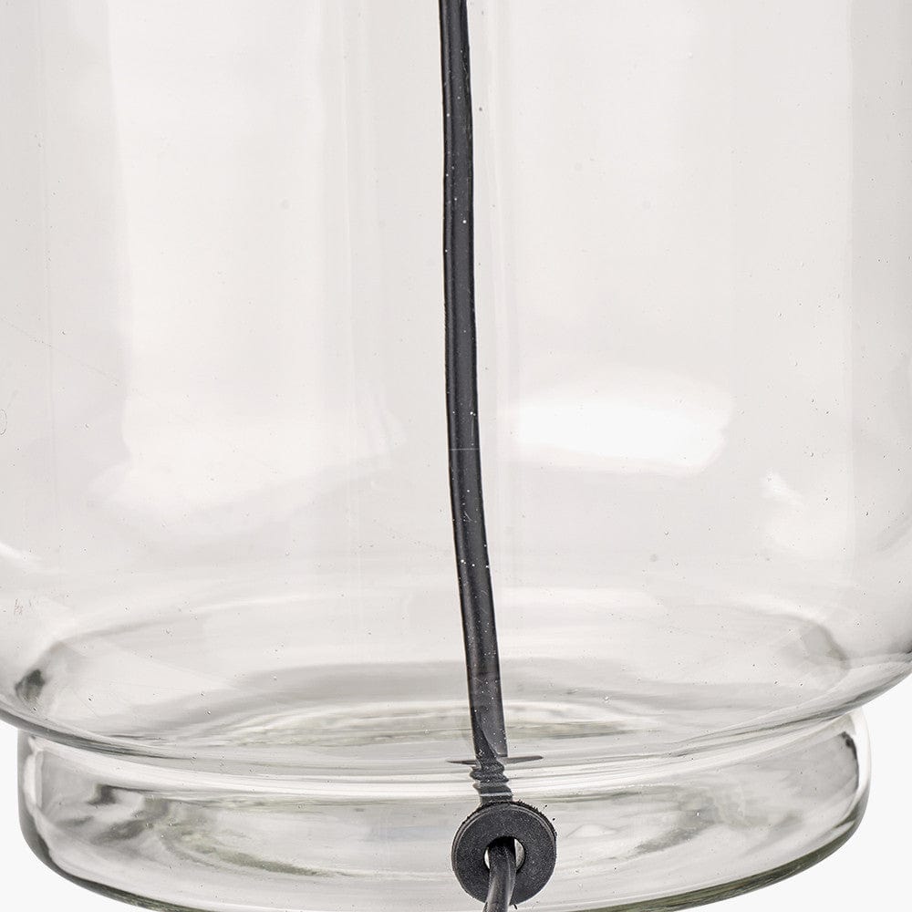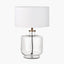The perfectly proportioned, clear glass table lamp is crafted in India and complemented by contrasting, antique brass metal base detailing, enhancing its classical styling. The beautiful base is topped off perfectly with a simple, modern ivory cylinder cotton mix lamp shade.