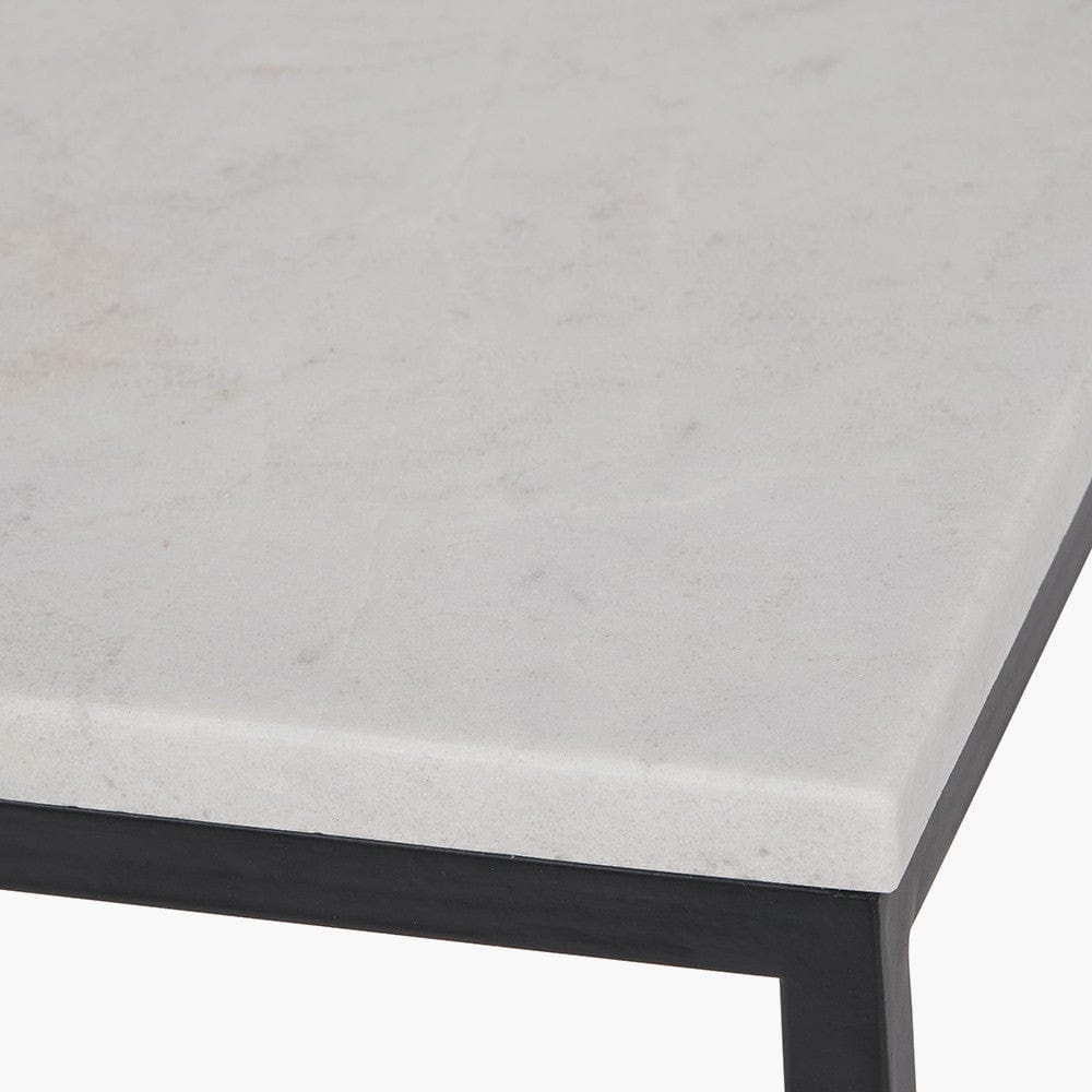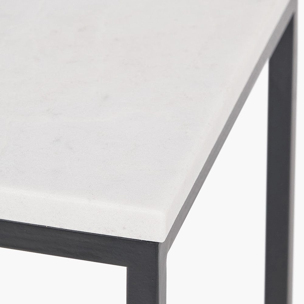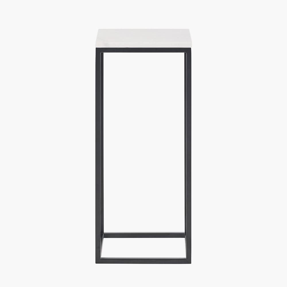 Introducing the Kalani White Marble and Black Metal Tall Square Side Table, the perfect addition to elevate your home decor. This stunning piece features a white marble top and sleek black metal legs, adding a touch of elegance to any room.
