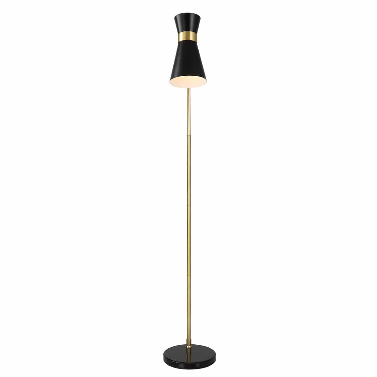 Finished in a beautiful gold, and sitting atop a black marble foot, this floor lamp features a black metal cone-shaped shade, surrounded by a gold band. The shade pivots, allowing you to focus better on the task at hand. Also available in white.