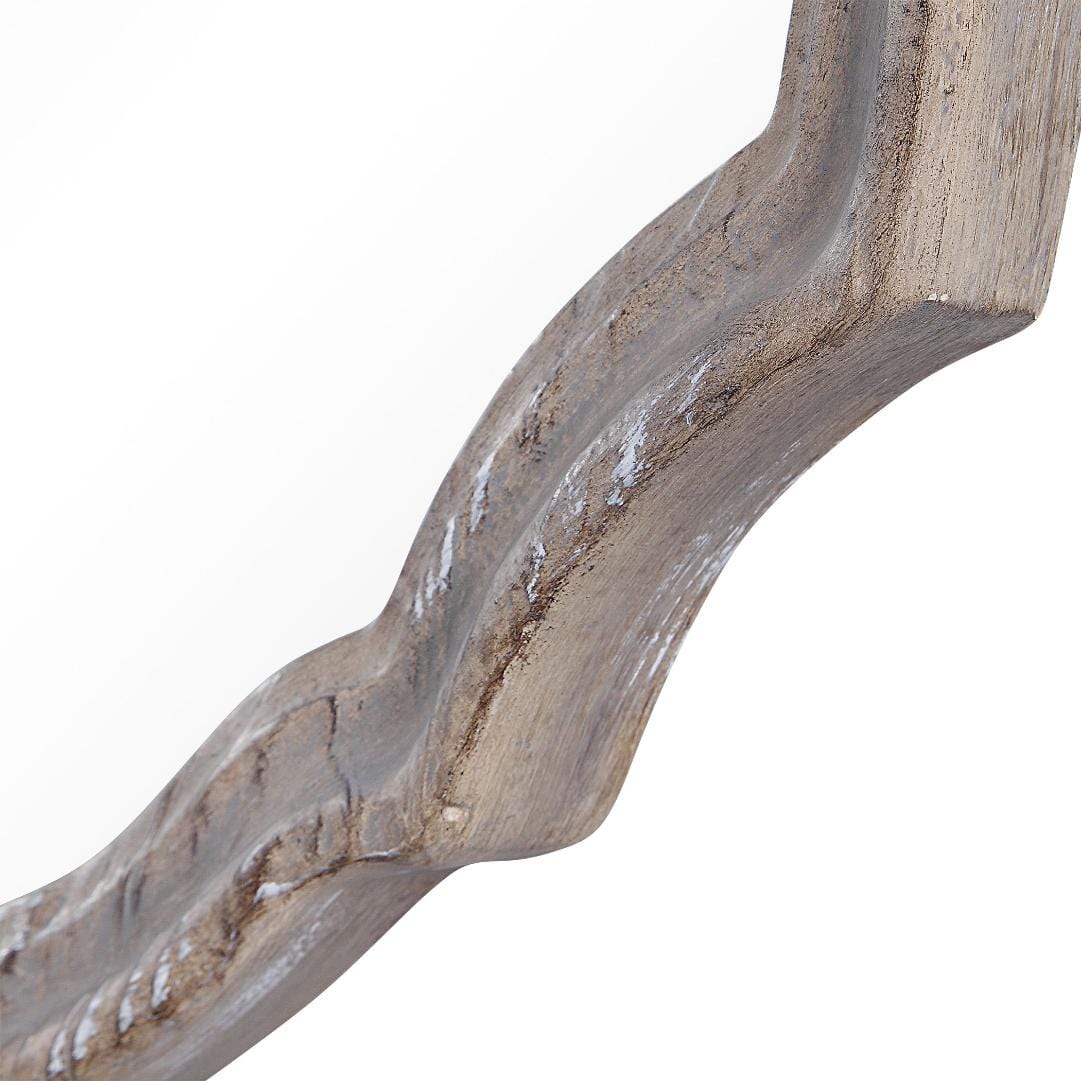 Finished to resemble natural wood, this frame's elegant curves are enhanced by the light ivory distressing. May be hung either vertically or horizontally.