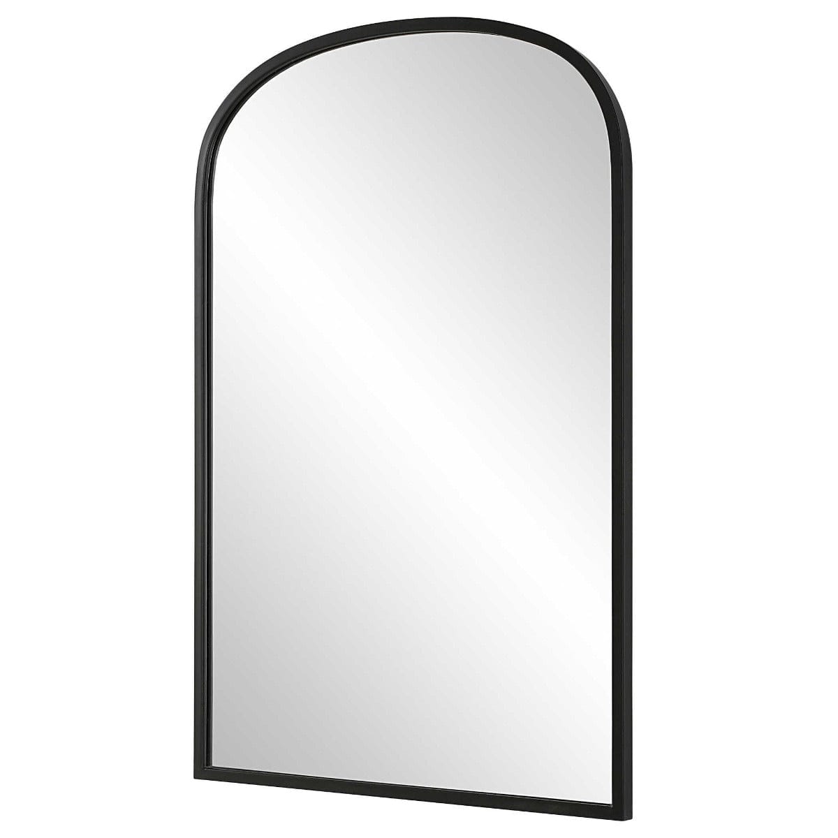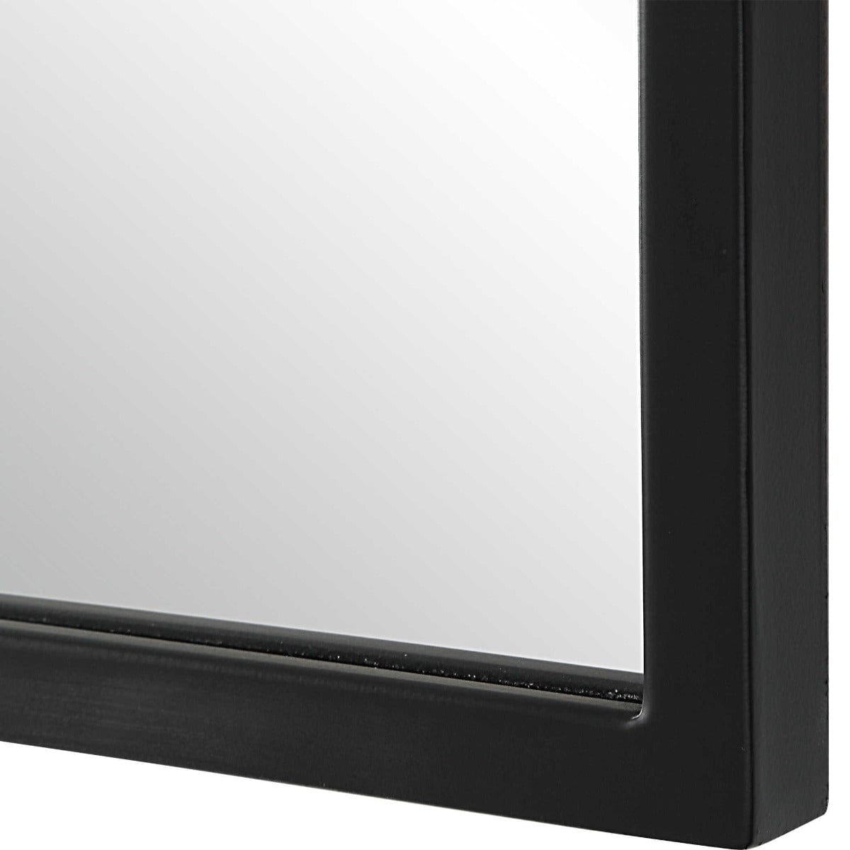 Slight arch top with radius corners give this frame a unique look. Finished in a satin black, the iron frame accentuates the overall design. Add a touch of style to a powder room or over a double vanity.