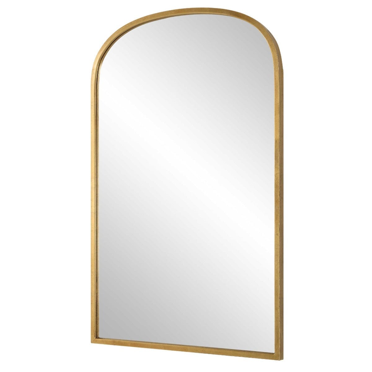 Slight arch top with radius corners give this frame a unique look. Finished in a gold leaf, the iron frame accentuates the overall design. Add a touch of style to a powder room or over a double vanity.